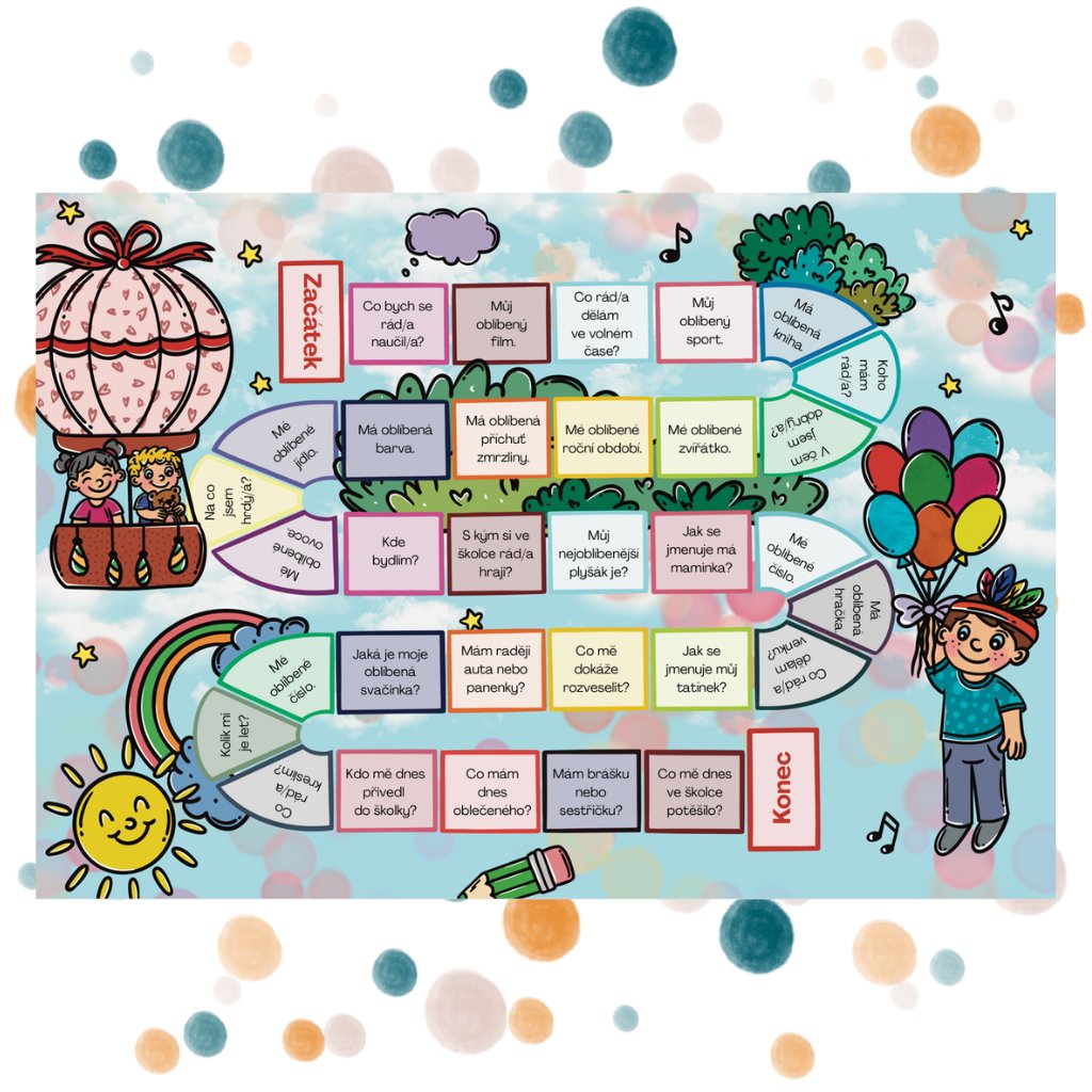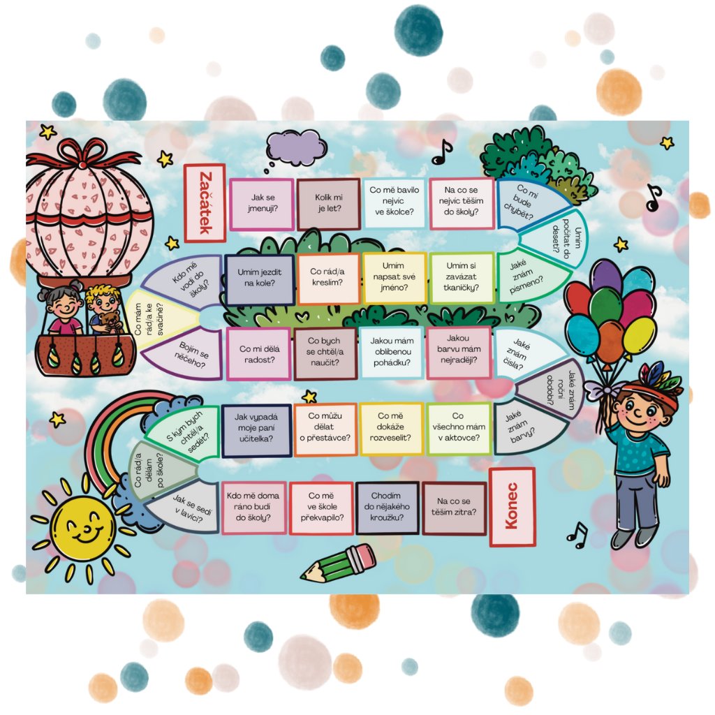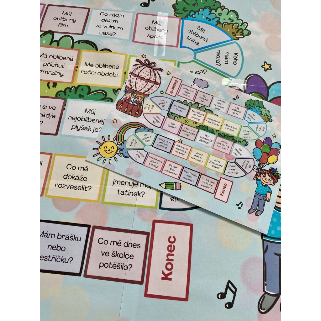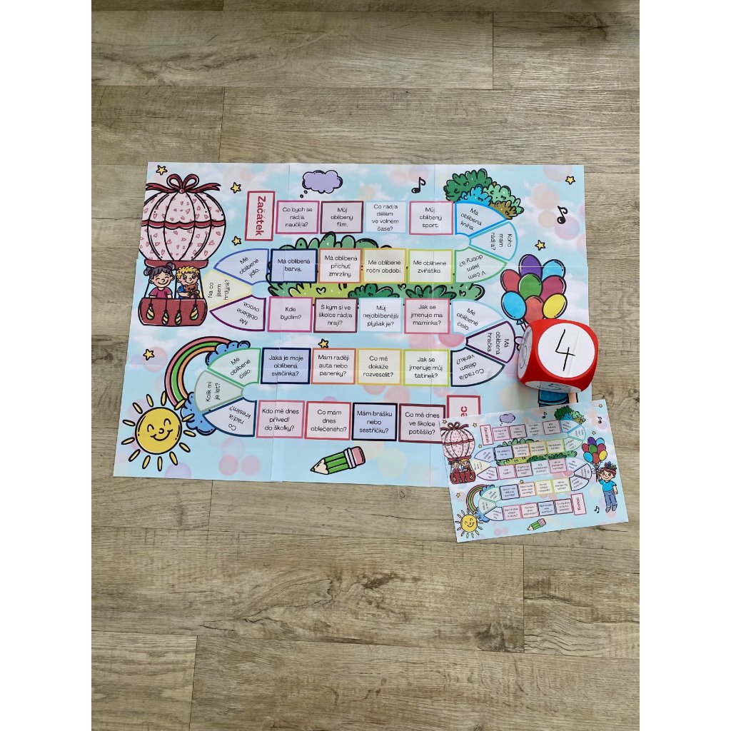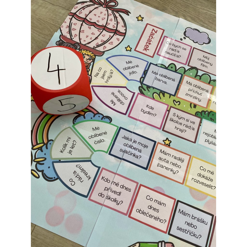Materiál obsahuje hrací plán se 32 políčky, na kterých děti čekají jednoduché a milé otázky jako například „Jak se jmenuji?“ nebo „Na co se těším do školy?“. Děti hází kostkou, postupují po hracím poli a odpovídají – díky tomu si budují vztahy, učí se naslouchat, vyjadřovat a sdílet své pocity.