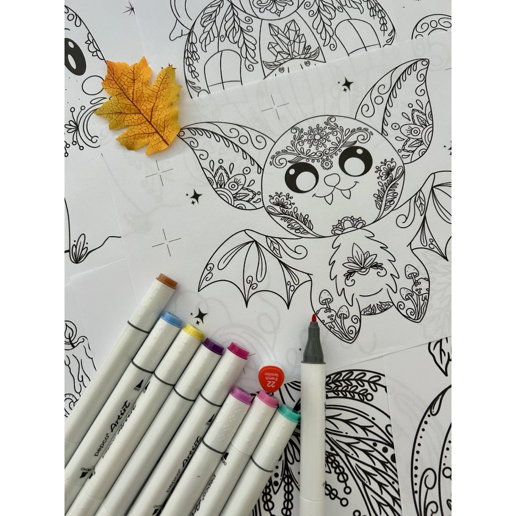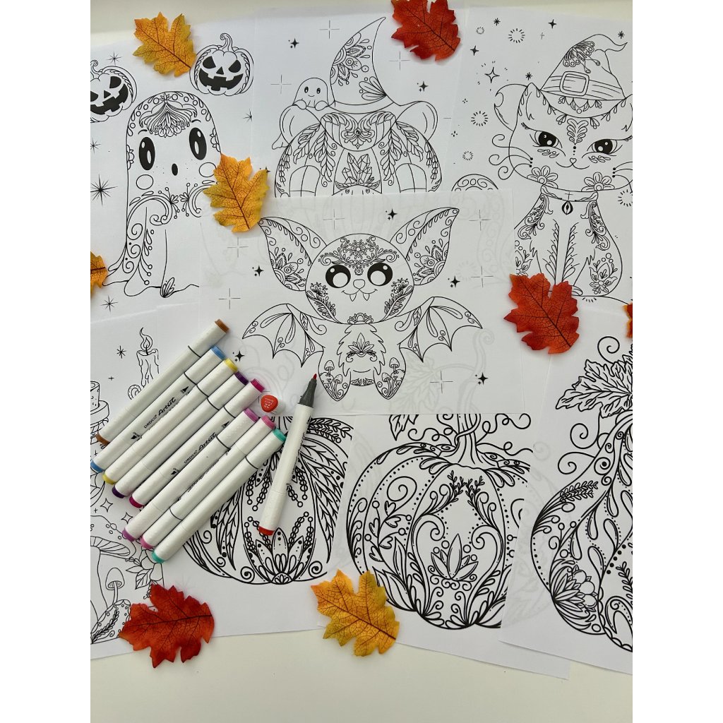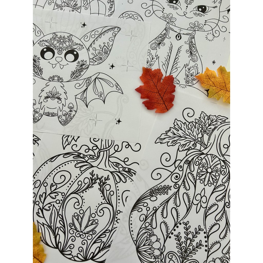 Omalovánky obsahují abstraktní vzory a motivy na téma Halloween - kočička, duch, netopýr, kotel, čarodějnická chaloupka, dýně a elixír.