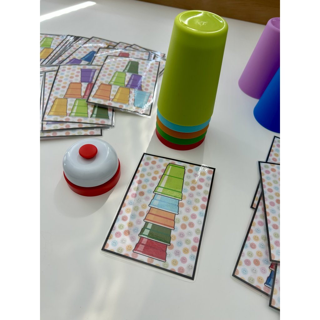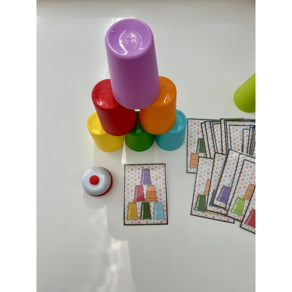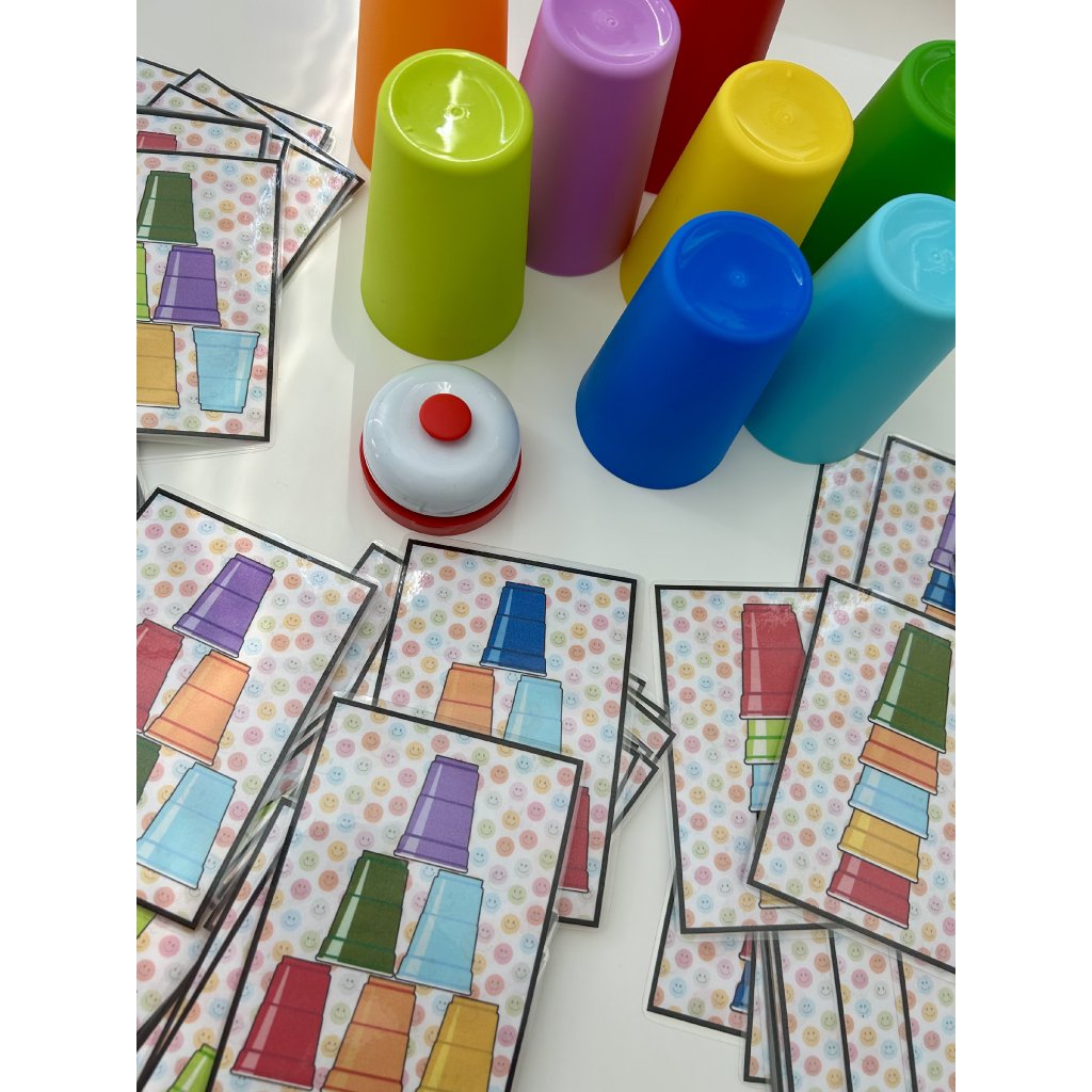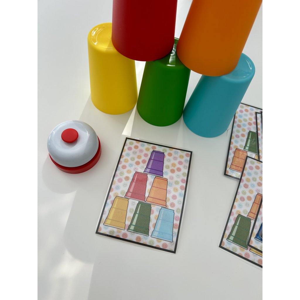 Děti pracují s barevnými kelímky (červená, světle zelená, tmavě zelená, tmavě modrá, fialová, světle modrá, žlutá a oranžová) podle zadaného vzoru na kartičce. Do hry je také zapojen zvonek, kterým děti cinknou, jakmile mají hotovo – kdo je nejrychlejší a má správně, získává bod!