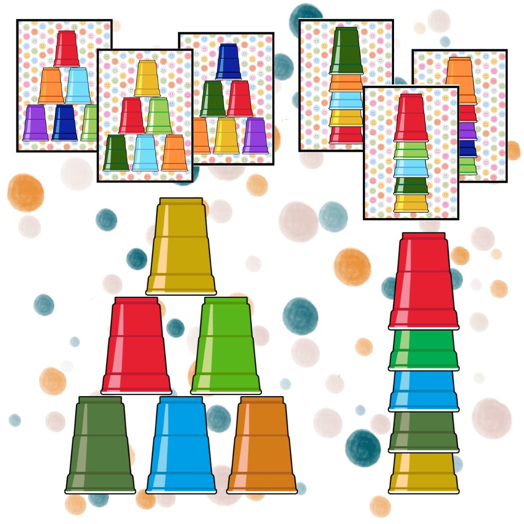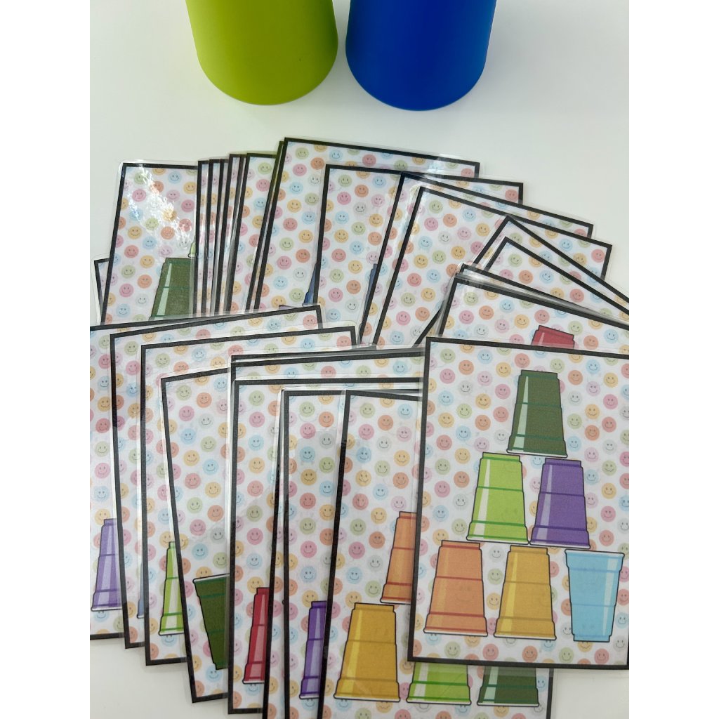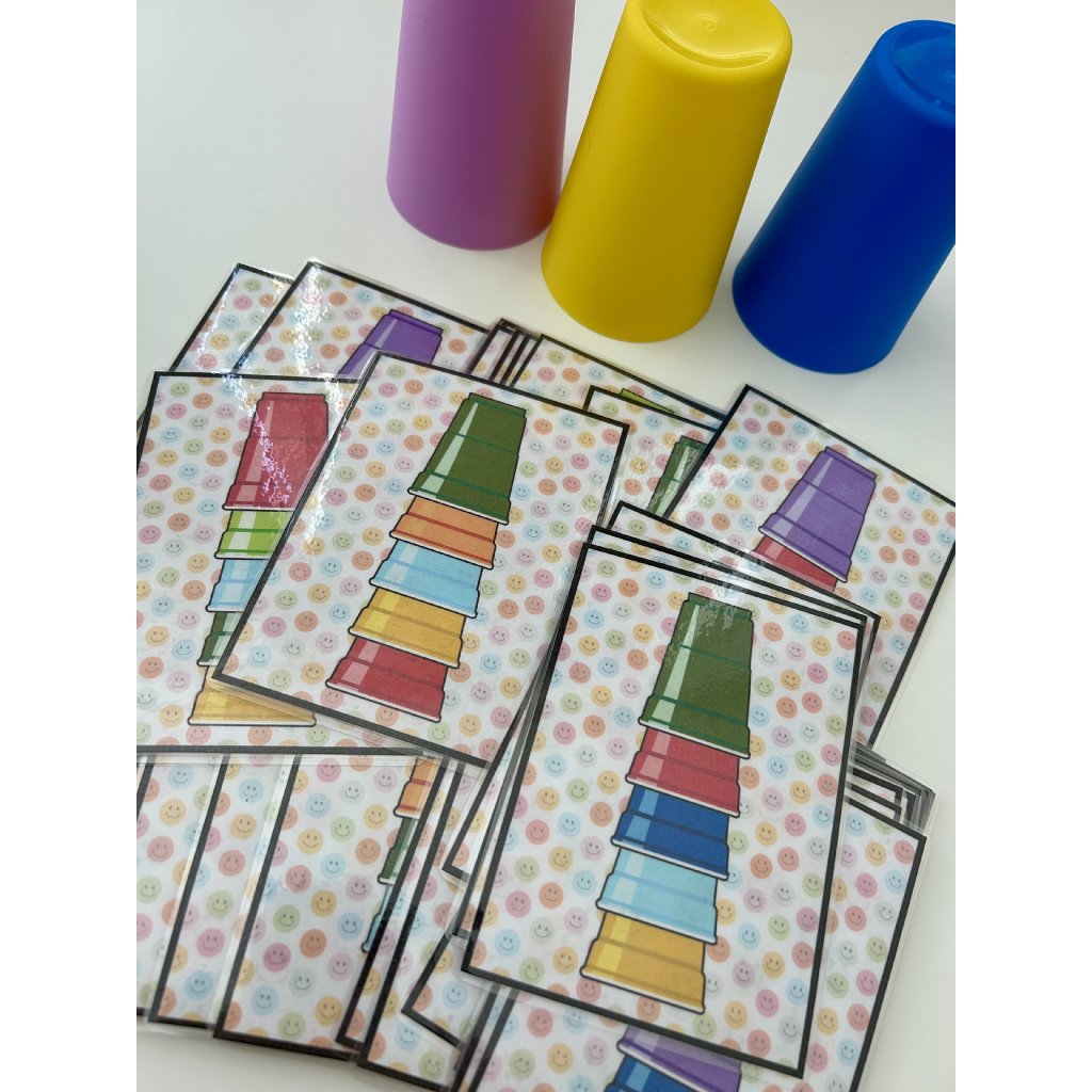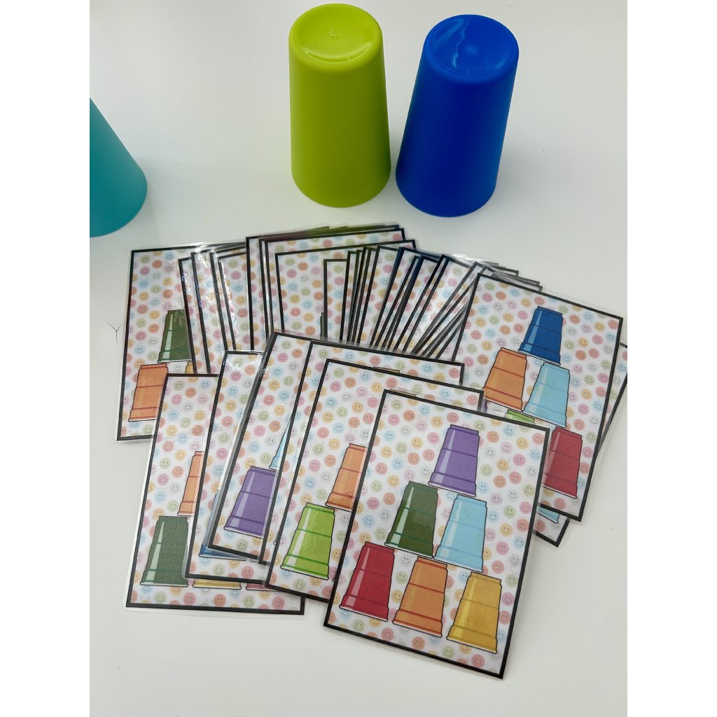 Děti pracují s barevnými kelímky (červená, světle zelená, tmavě zelená, tmavě modrá, fialová, světle modrá, žlutá a oranžová) podle zadaného vzoru na kartičce. Do hry je také zapojen zvonek, kterým děti cinknou, jakmile mají hotovo – kdo je nejrychlejší a má správně, získává bod!