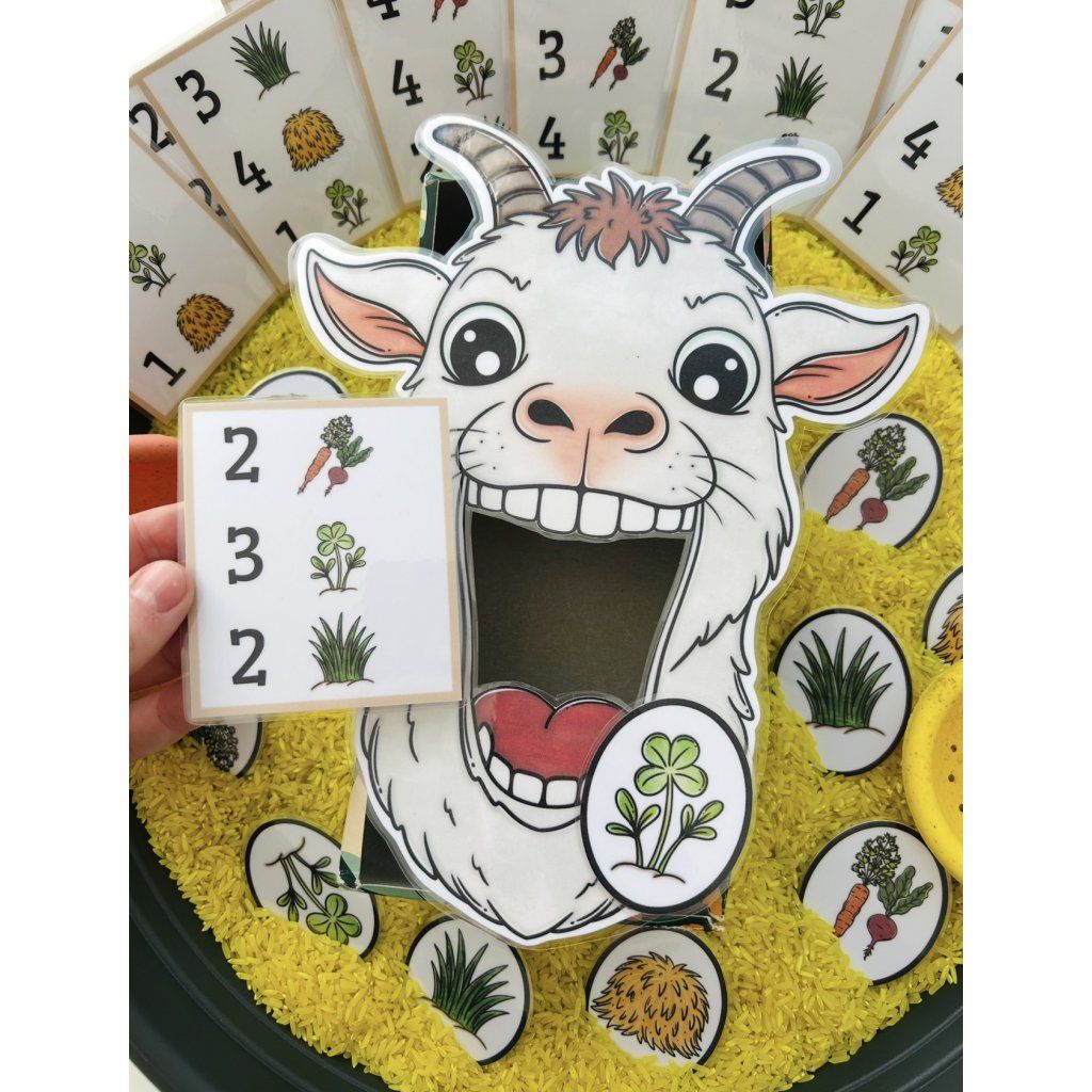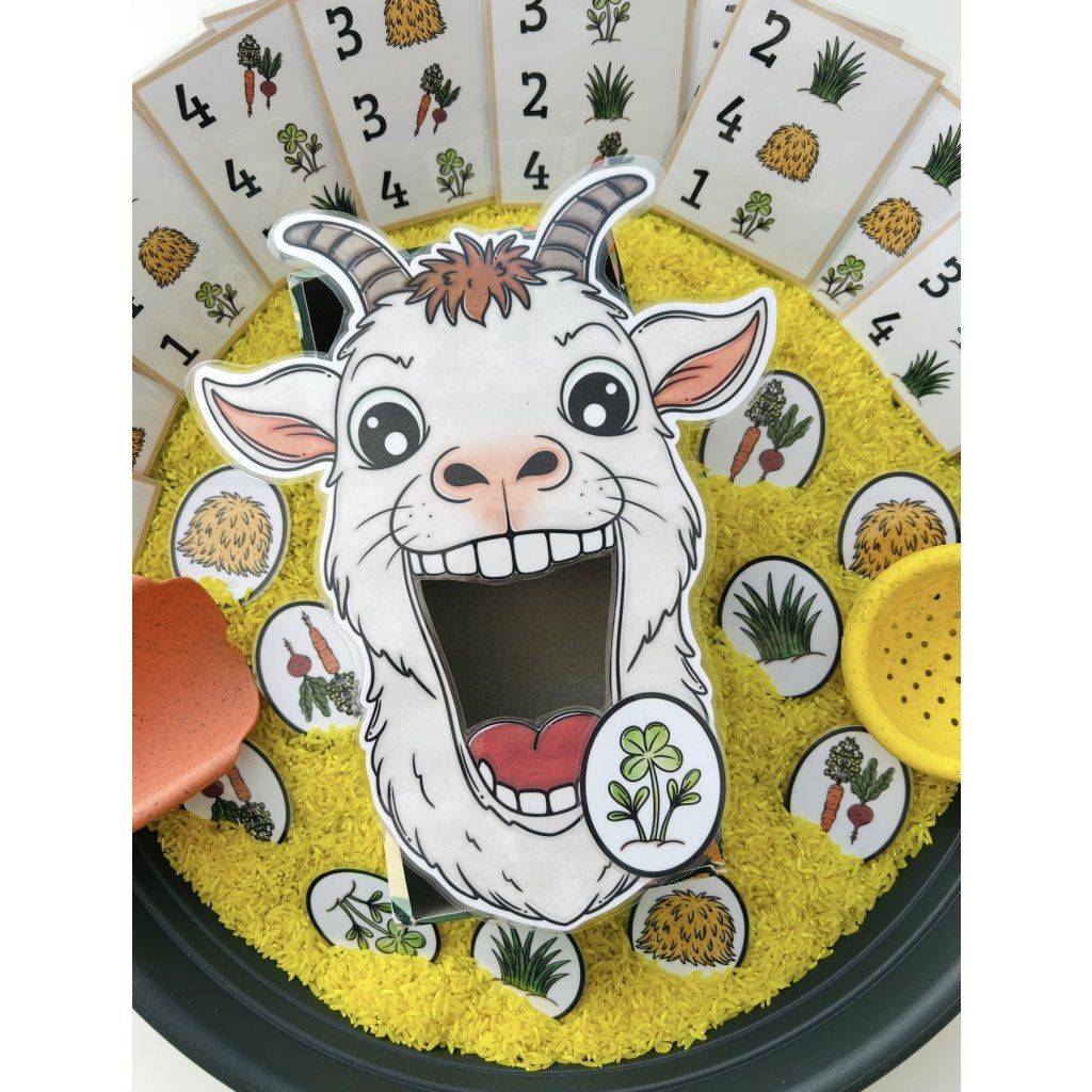 Hledání potravy v sypkém materiálu a krmení zvířat podle zadání. Procvičuje jemnou motoriku, soustředění i počítání.