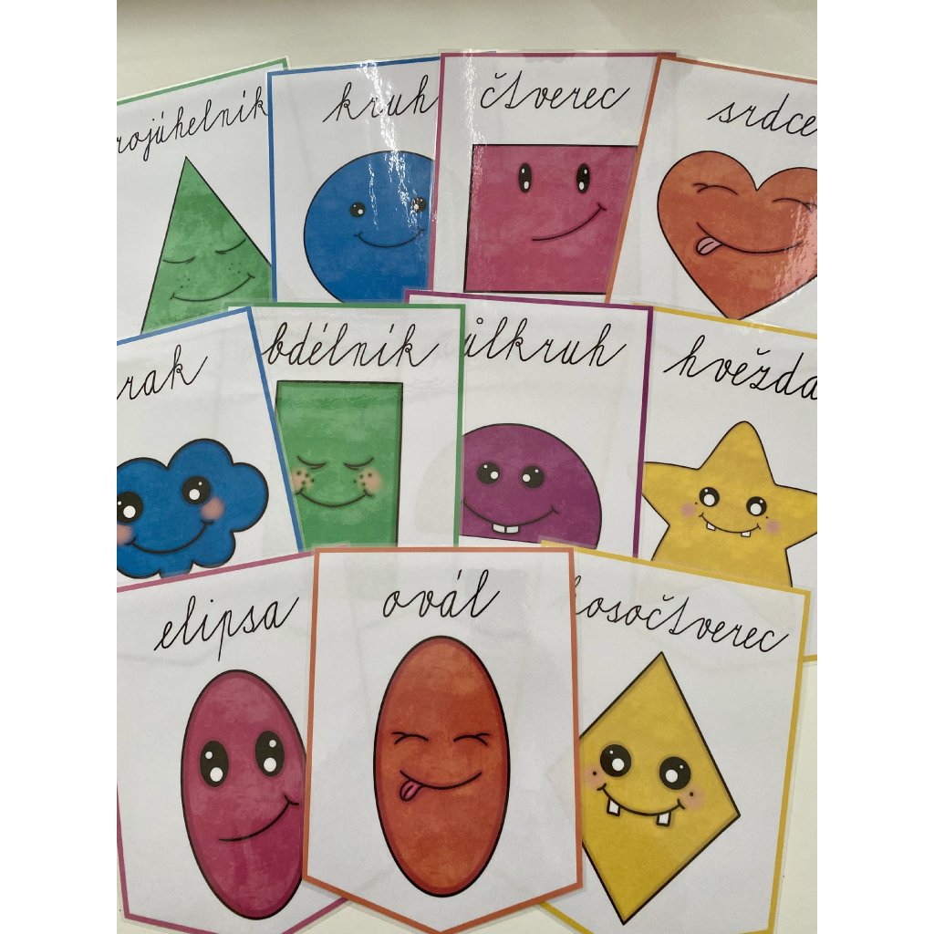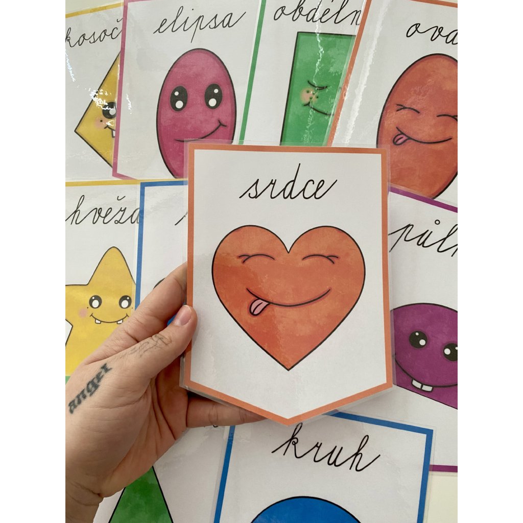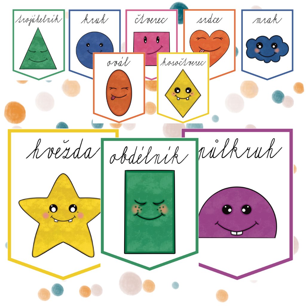 Tento materiál obsahuje 11 vlaječek s nejběžnějšími geometrickými tvary (např. kruh, čtverec, obdélník, trojúhelník, ovál, hvězda, srdce…). Na každé vlaječce najdete název tvaru a ilustraci roztomilého, usměvavého tvaru, který děti zaujme na první pohled.