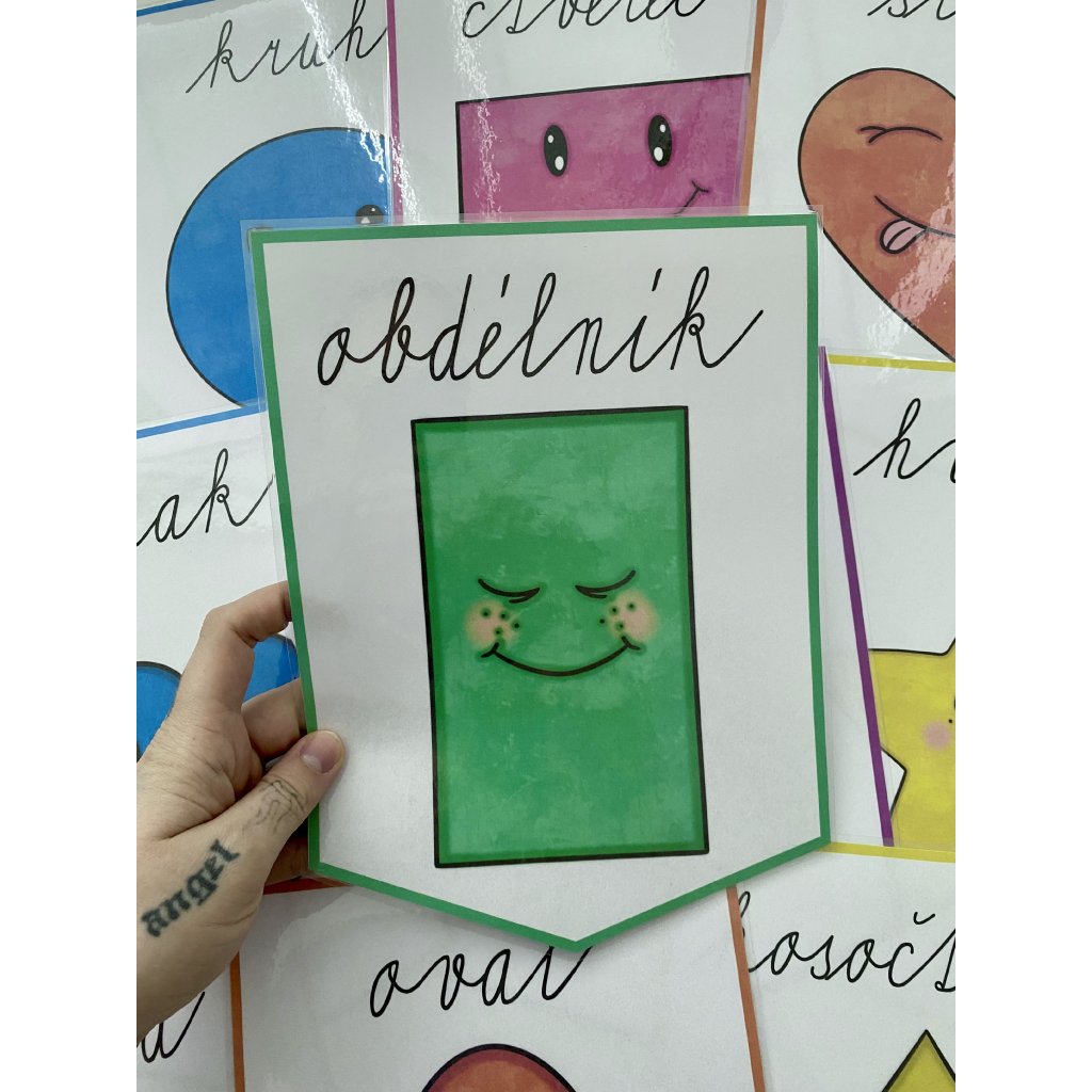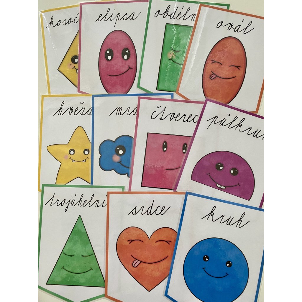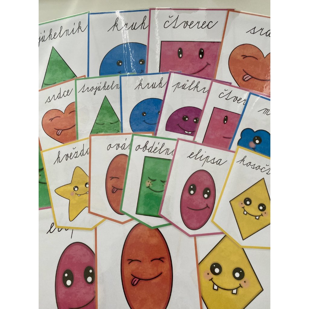 Tento materiál obsahuje 11 vlaječek s nejběžnějšími geometrickými tvary (např. kruh, čtverec, obdélník, trojúhelník, ovál, hvězda, srdce…). Na každé vlaječce najdete název tvaru a ilustraci roztomilého, usměvavého tvaru, který děti zaujme na první pohled.