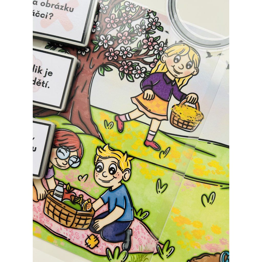 Tento originální a vizuálně poutavý materiál je ideální pro rozvoj porozumění textu, pozornosti, logického uvažování a jemné motoriky. Jeho středobodem je barevný obrázek, který zachycuje hravou jarní scénu.