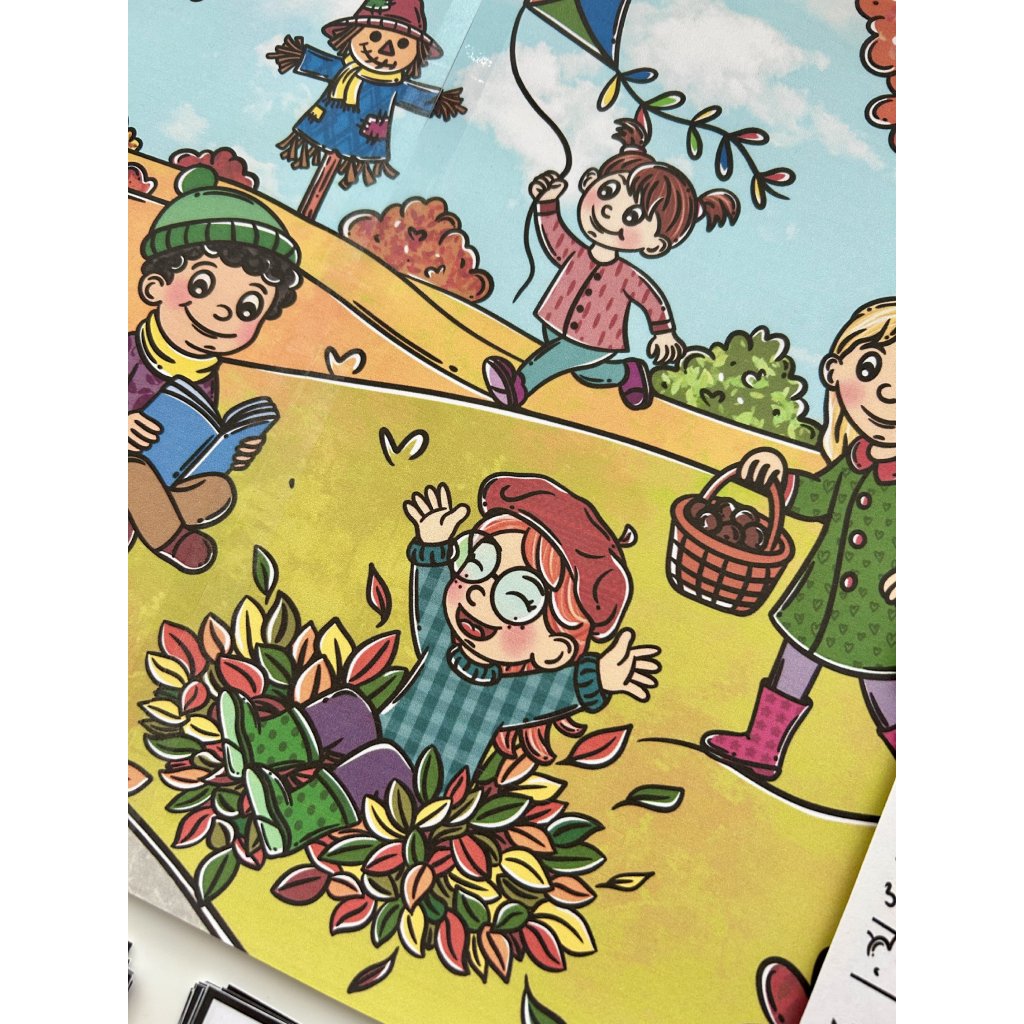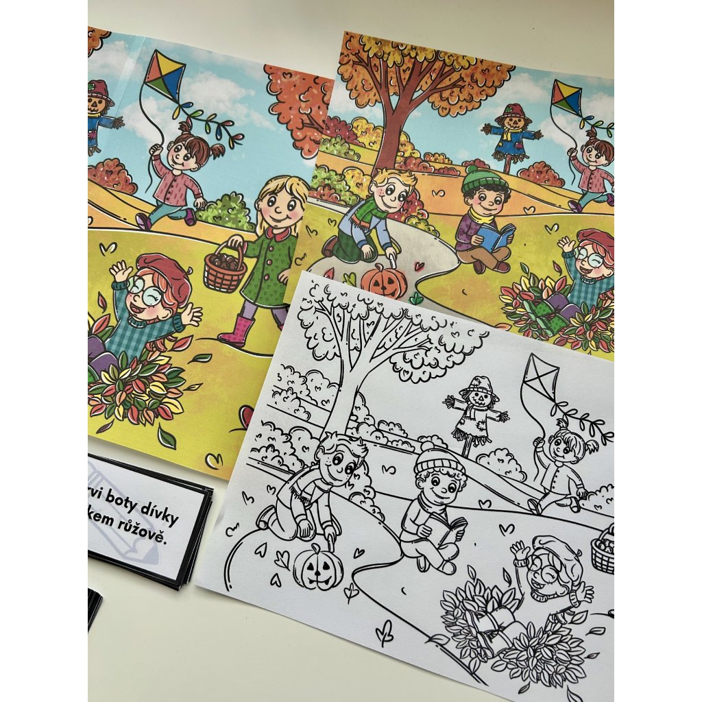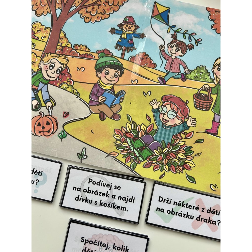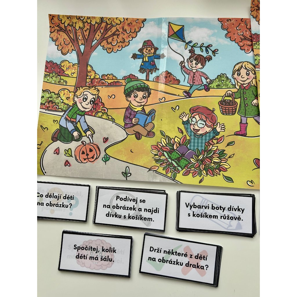 Tento originální a vizuálně poutavý materiál je ideální pro rozvoj porozumění textu, pozornosti, logického uvažování a jemné motoriky. Jeho středobodem je barevný obrázek, který zachycuje hravou podzimní scénu.