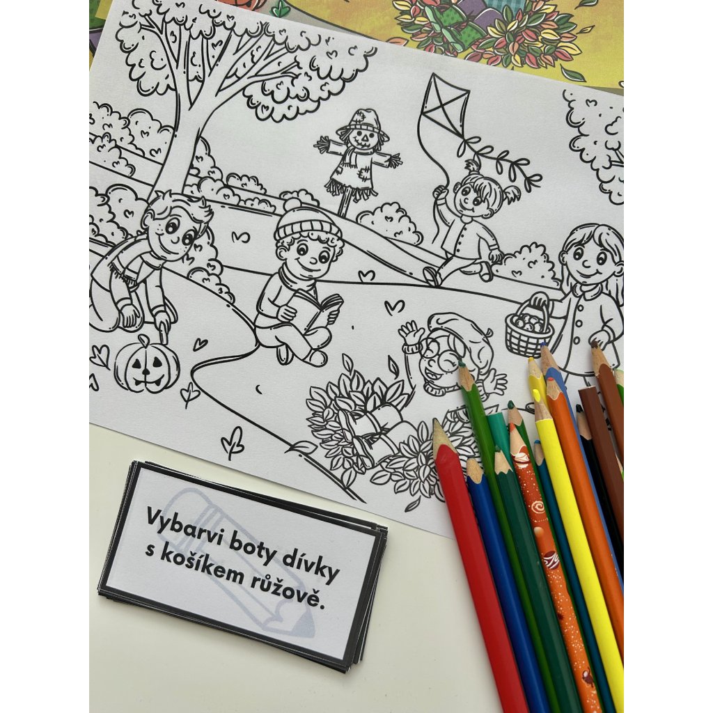 - Černobílá verze téhož obrázku, ke které náleží 30 vybarvovacích zadání. Každá kartička dětem říká, co a jak mají na obrázku vybarvit – buď konkrétní věc, nebo např. objekt určité barvy či tvaru. Tato část je skvělá na rozvoj porozumění a orientace v prostoru, a zároveň podporuje trpělivost a přesnost.