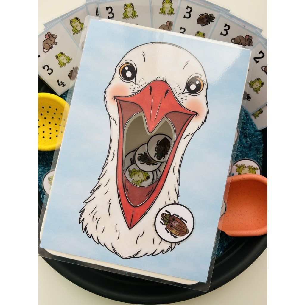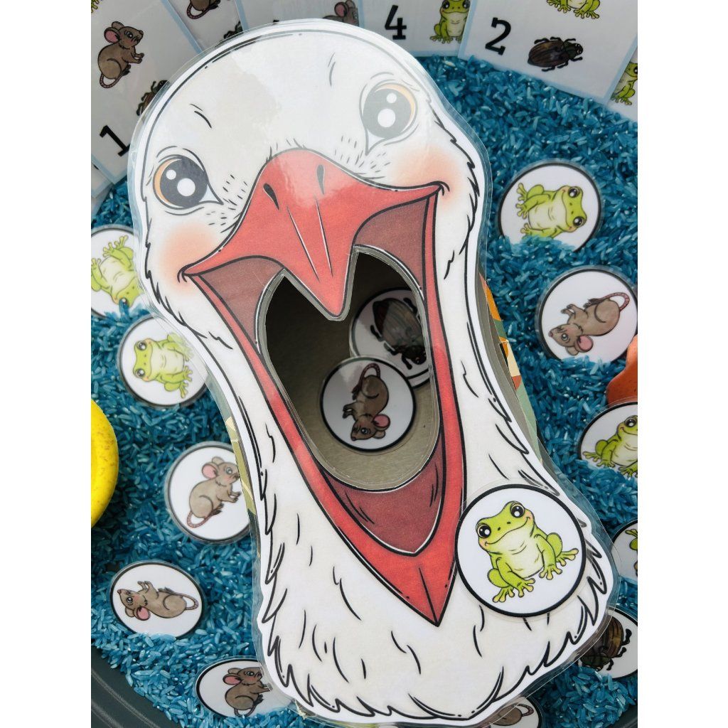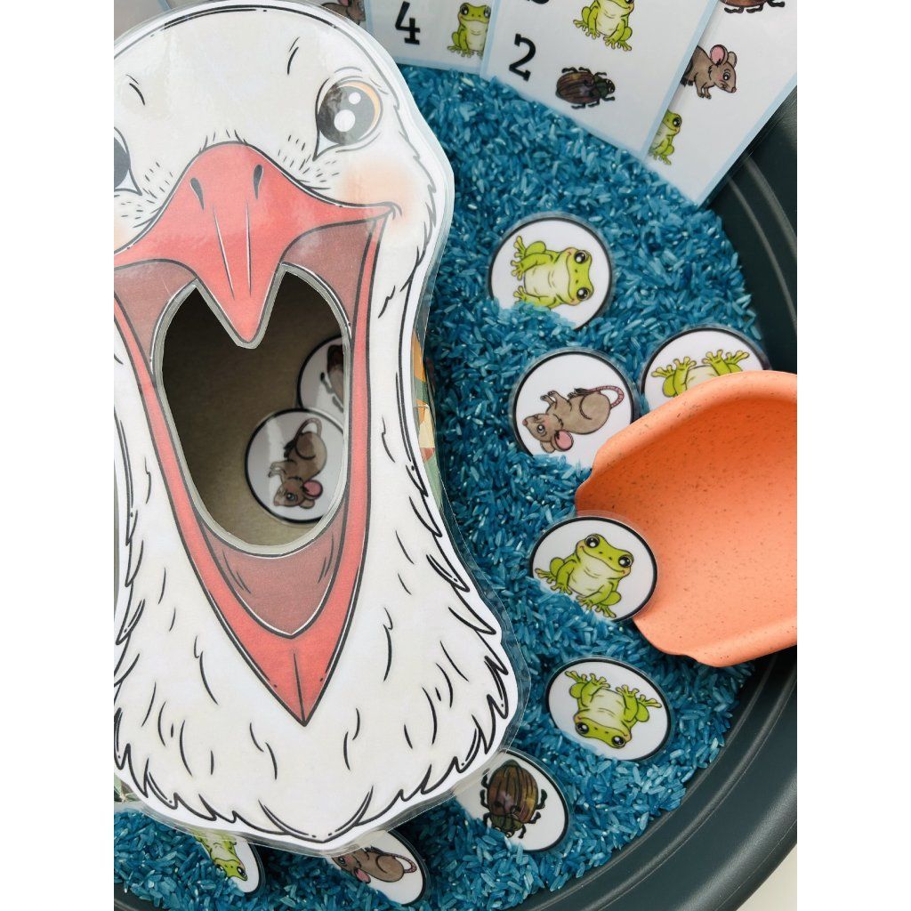 Tento materiál je jako stvořený pro sensory play, které děti přirozeně milují. Kartičky s potravou se vkládají do sypkého materiálu (např. rýže, cizrna, těstoviny), kde je děti hledají, objevují a následně krmí čápa – čímž dochází k intenzivnímu zapojení smyslů i soustředění.