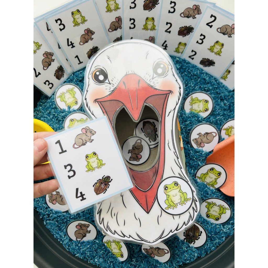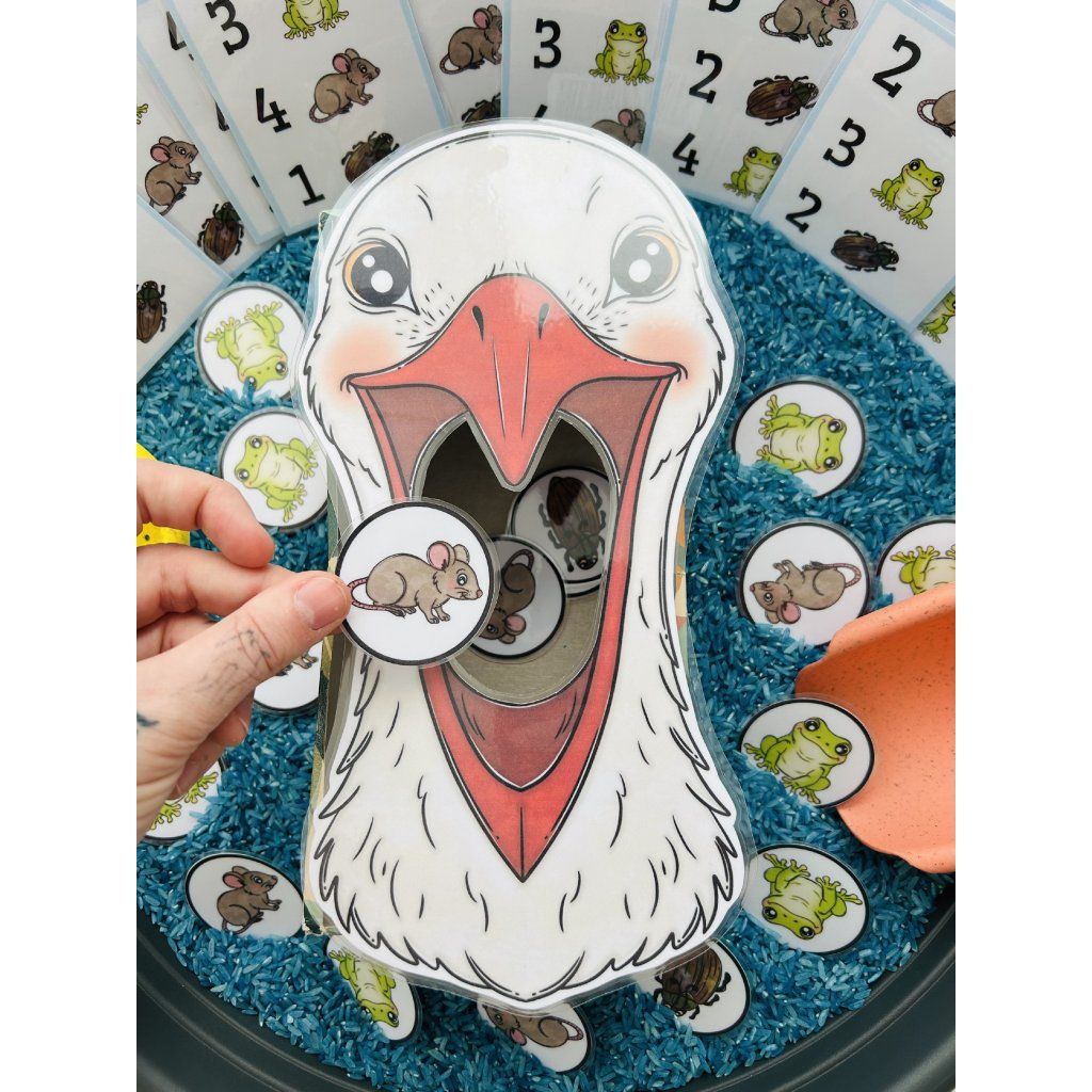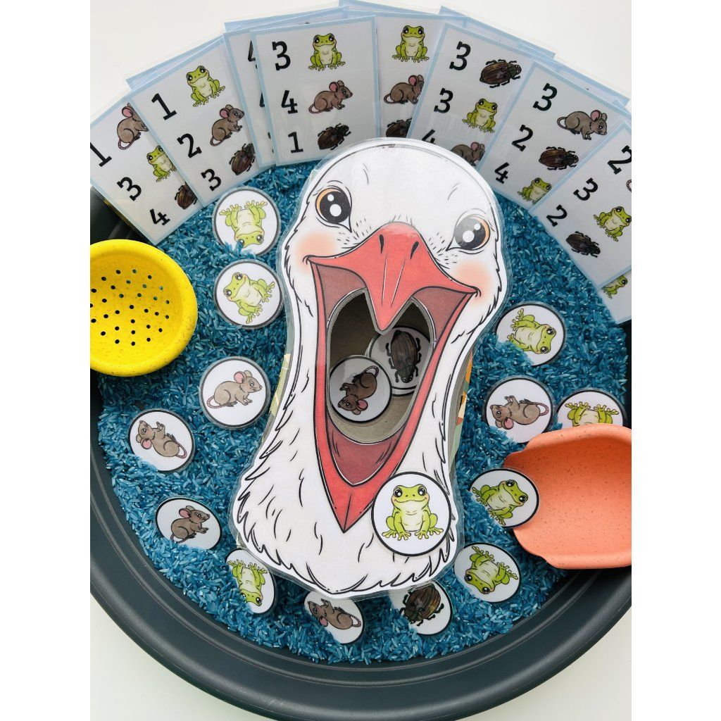 Tento materiál je jako stvořený pro sensory play, které děti přirozeně milují. Kartičky s potravou se vkládají do sypkého materiálu (např. rýže, cizrna, těstoviny), kde je děti hledají, objevují a následně krmí čápa – čímž dochází k intenzivnímu zapojení smyslů i soustředění.