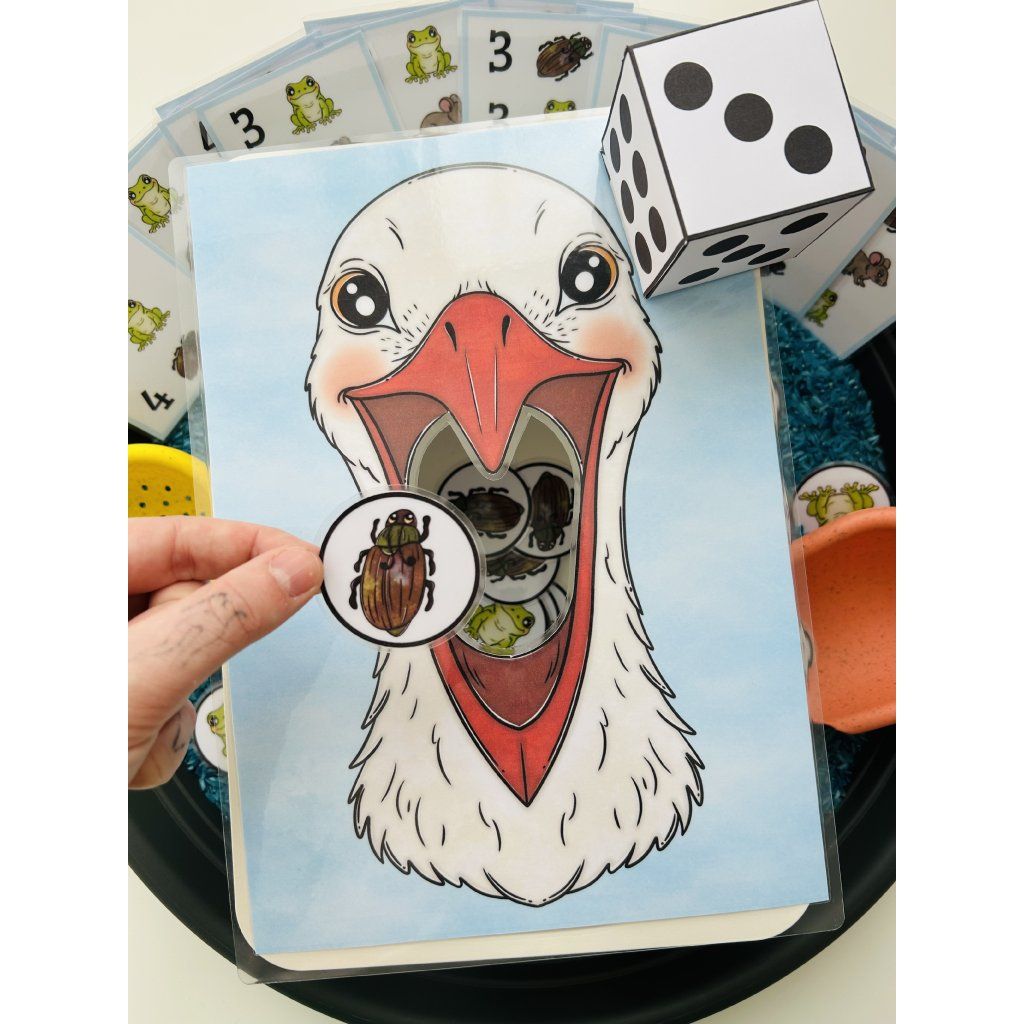 Materiál obsahuje hlavu čápa s barevným pozadím i bez pozadí, 30 kartiček s potravou, 15 kartiček se zadáním a kostky.