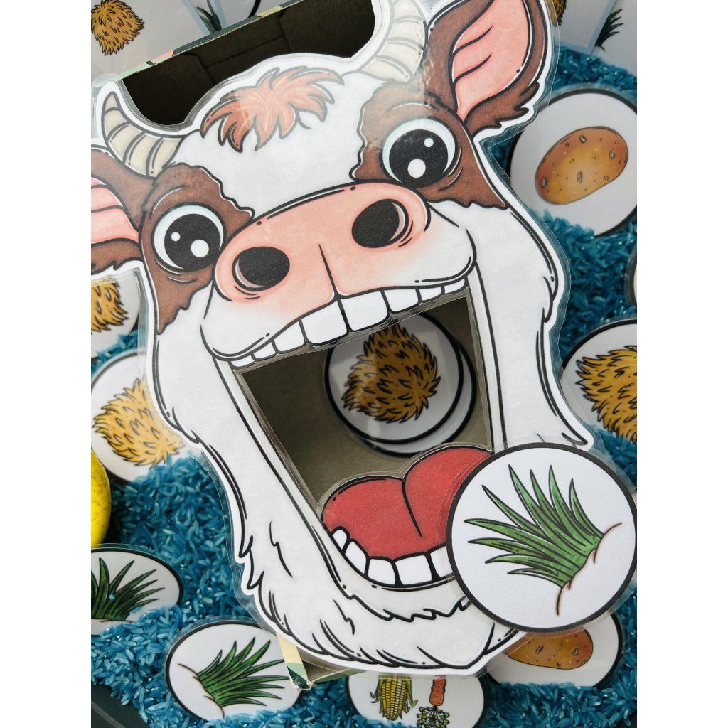 Materiál obsahuje hlavu krávy s barevným pozadím i bez pozadí, 30 kartiček s potravou, 15 kartiček se zadáním a kostky.