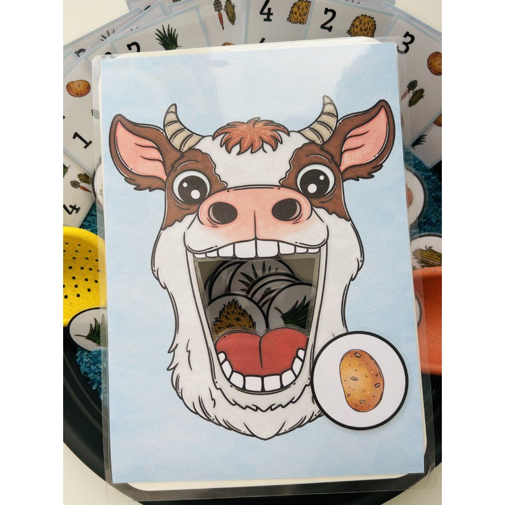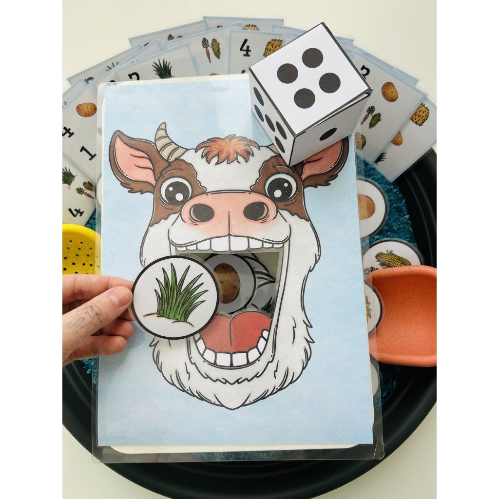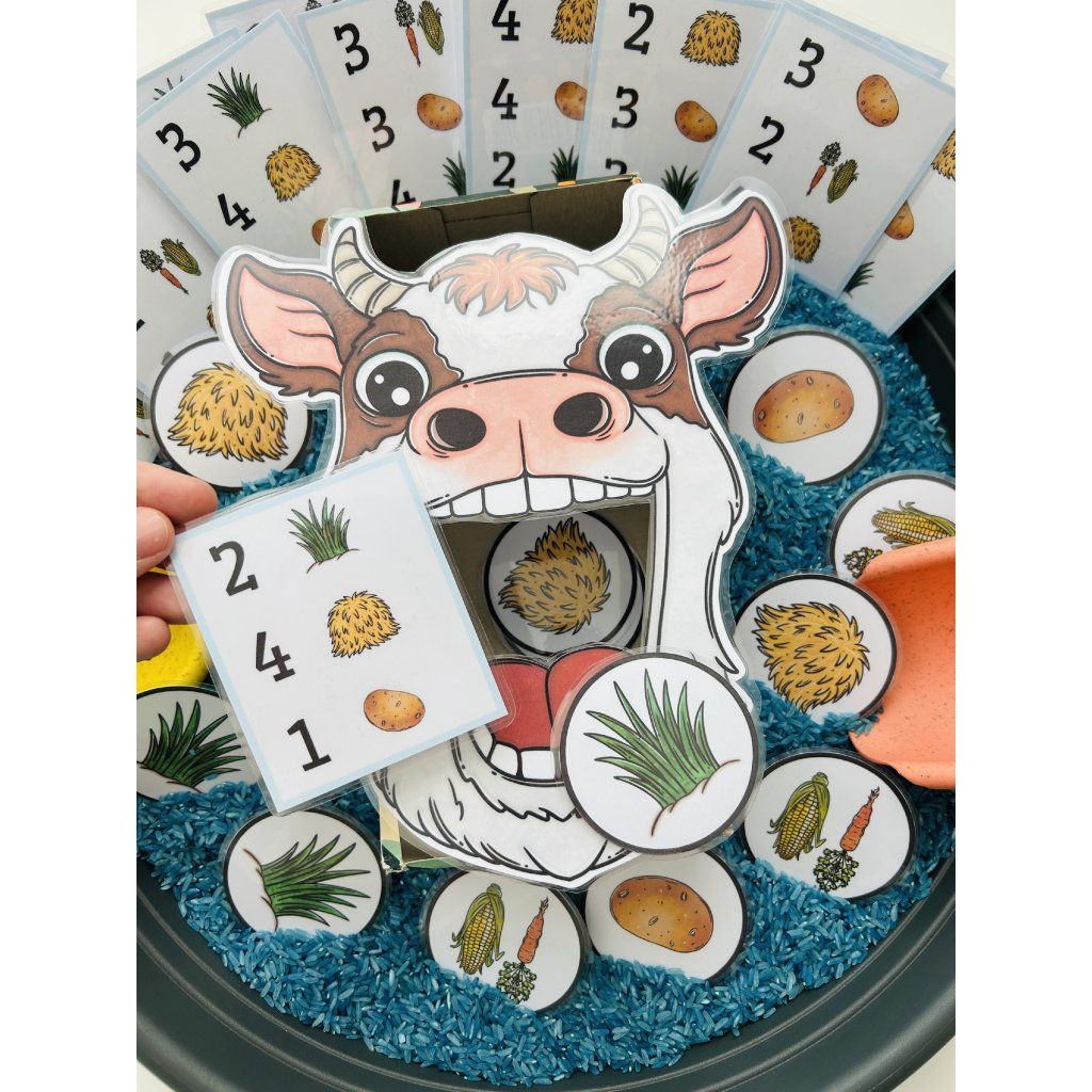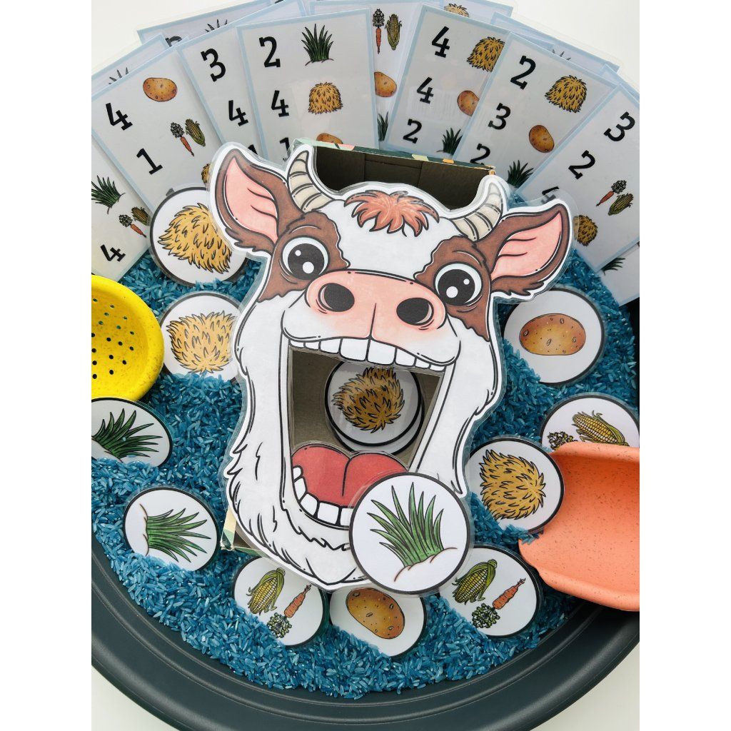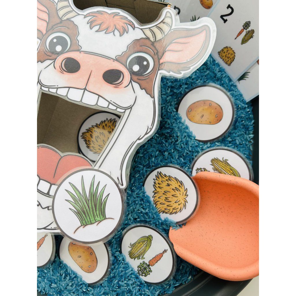 Tento materiál je jako stvořený pro sensory play, které děti přirozeně milují. Kartičky s potravou se vkládají do sypkého materiálu (např. rýže, cizrna, těstoviny), kde je děti hledají, objevují a následně krmí krávu – čímž dochází k intenzivnímu zapojení smyslů i soustředění.