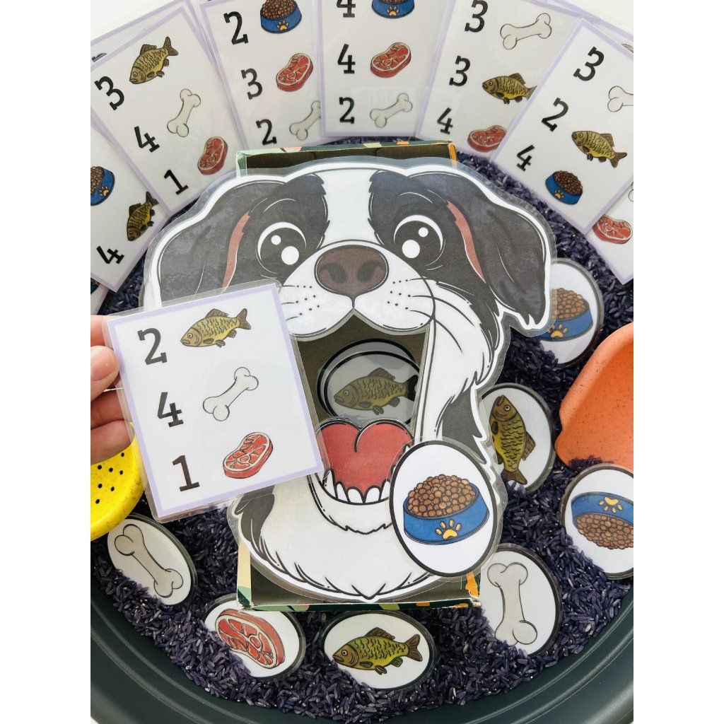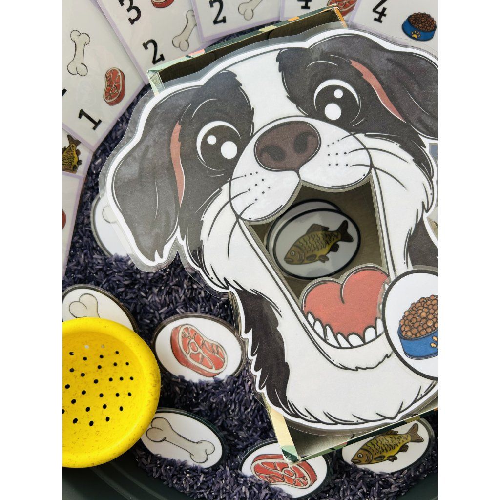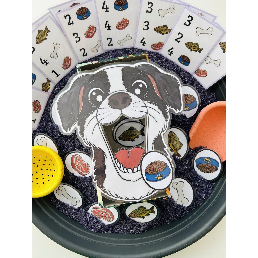 Tento materiál je jako stvořený pro sensory play, které děti přirozeně milují. Kartičky s potravou se vkládají do sypkého materiálu (např. rýže, cizrna, těstoviny), kde je děti hledají, objevují a následně krmí psa – čímž dochází k intenzivnímu zapojení smyslů i soustředění.