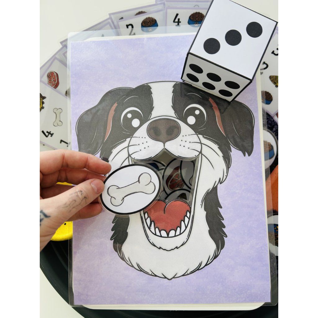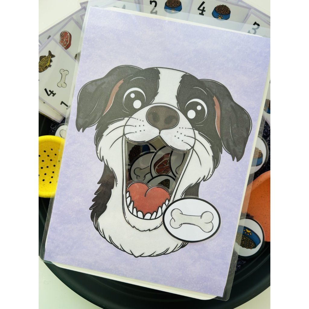 Materiál obsahuje hlavu psa s barevným pozadím i bez pozadí, 30 kartiček s potravou, 15 kartiček se zadáním a kostky.