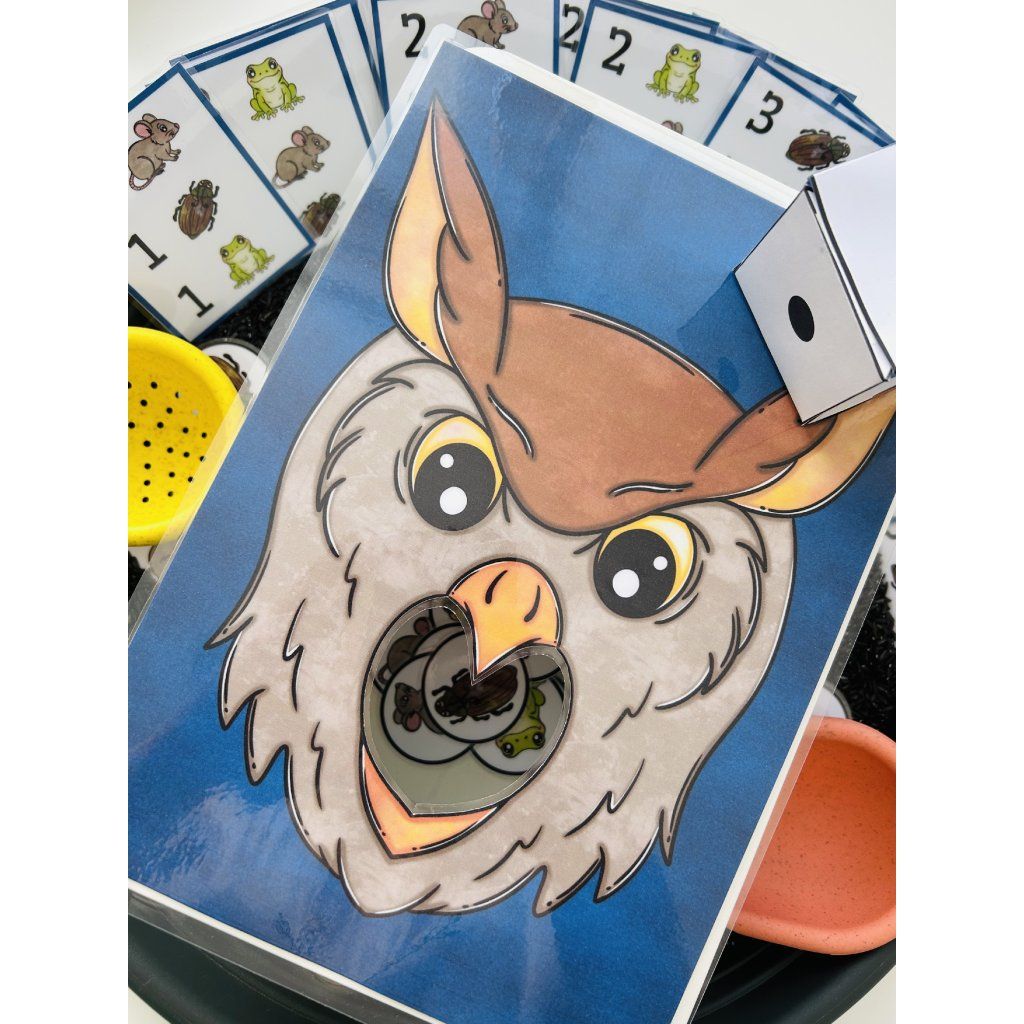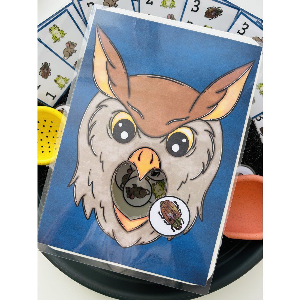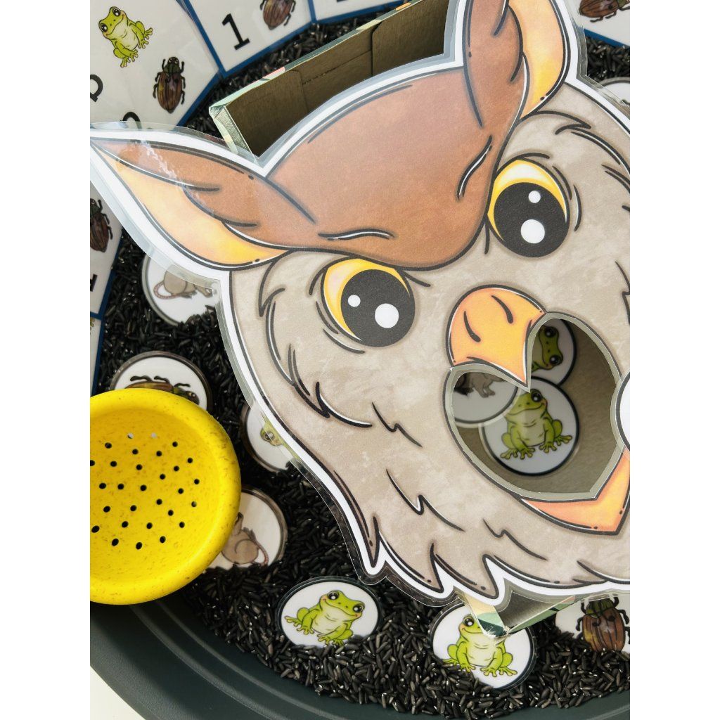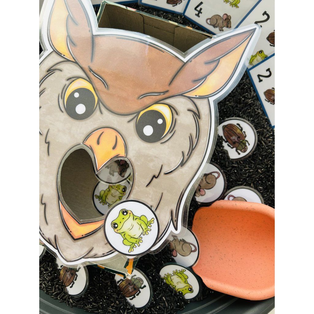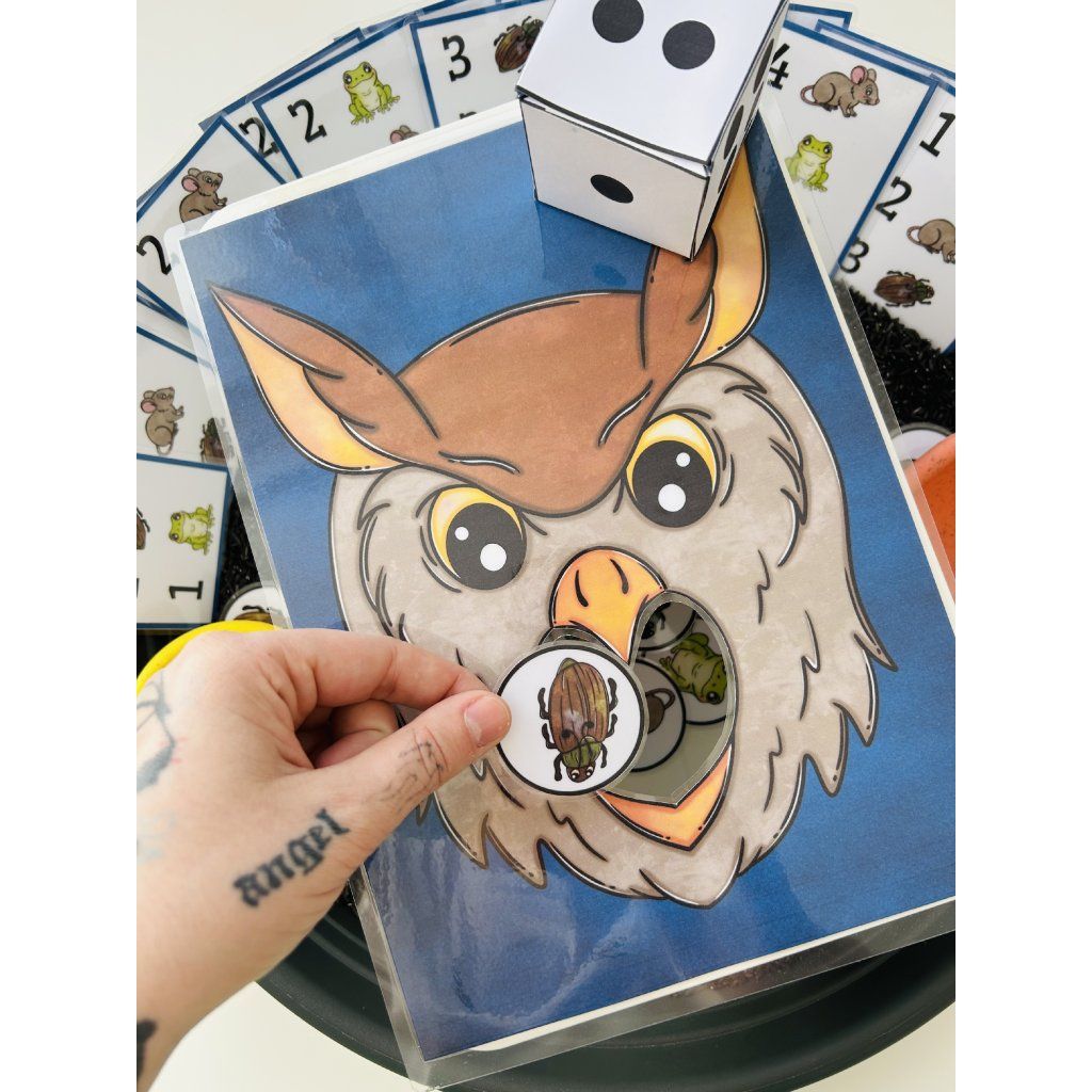 Materiál obsahuje hlavu sovy s barevným pozadím i bez pozadí, 30 kartiček s potravou, 15 kartiček se zadáním a kostky.