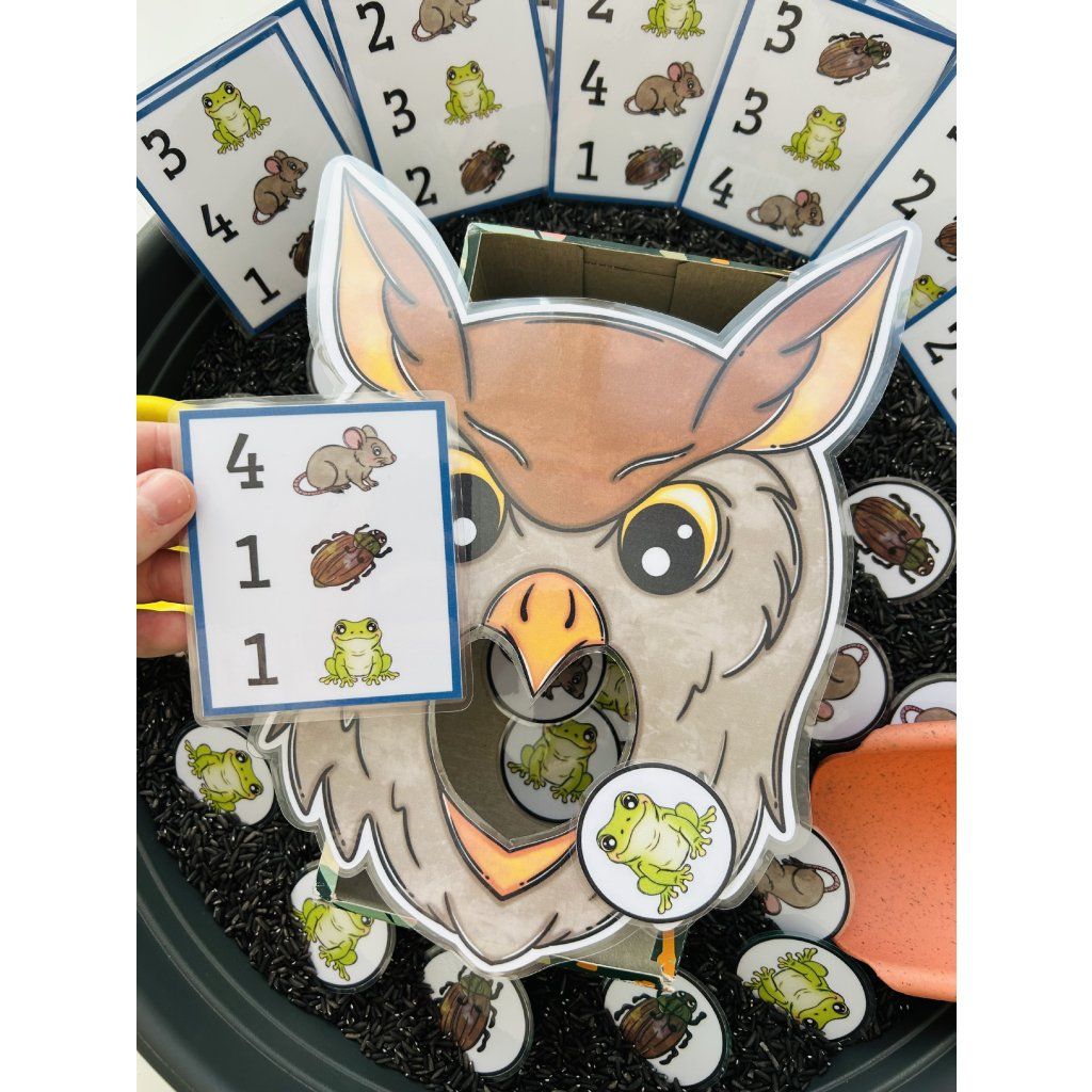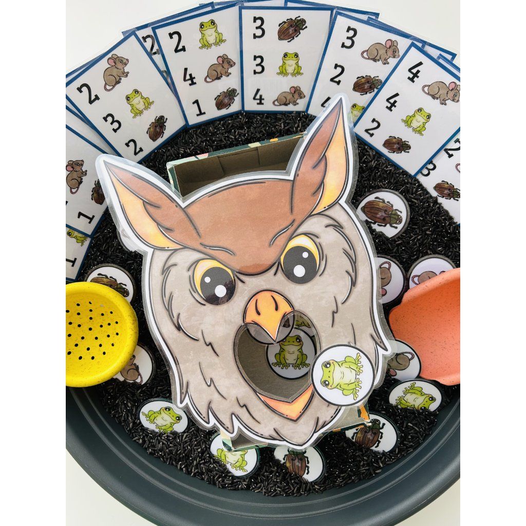 Tento materiál je jako stvořený pro sensory play, které děti přirozeně milují. Kartičky s potravou se vkládají do sypkého materiálu (např. rýže, cizrna, těstoviny), kde je děti hledají, objevují a následně krmí sovu – čímž dochází k intenzivnímu zapojení smyslů i soustředění.
