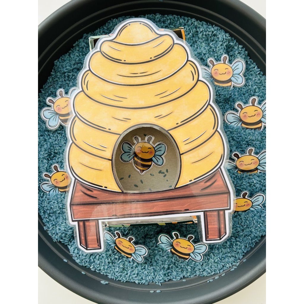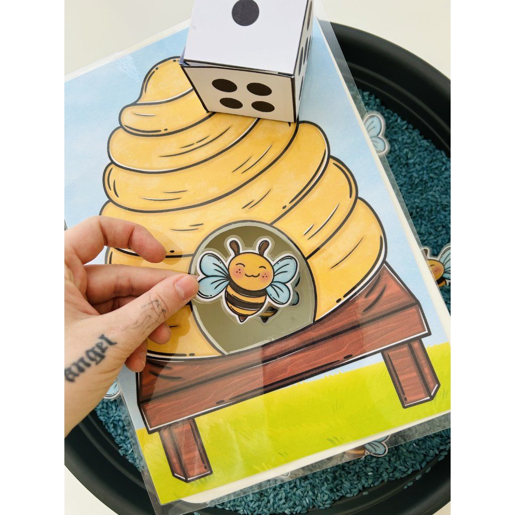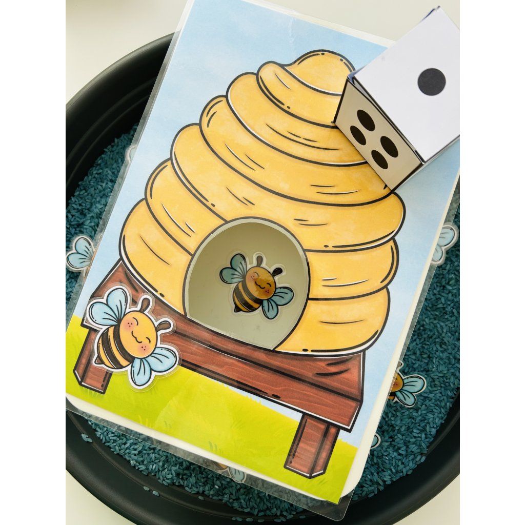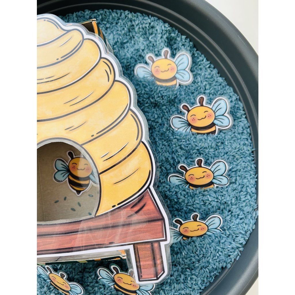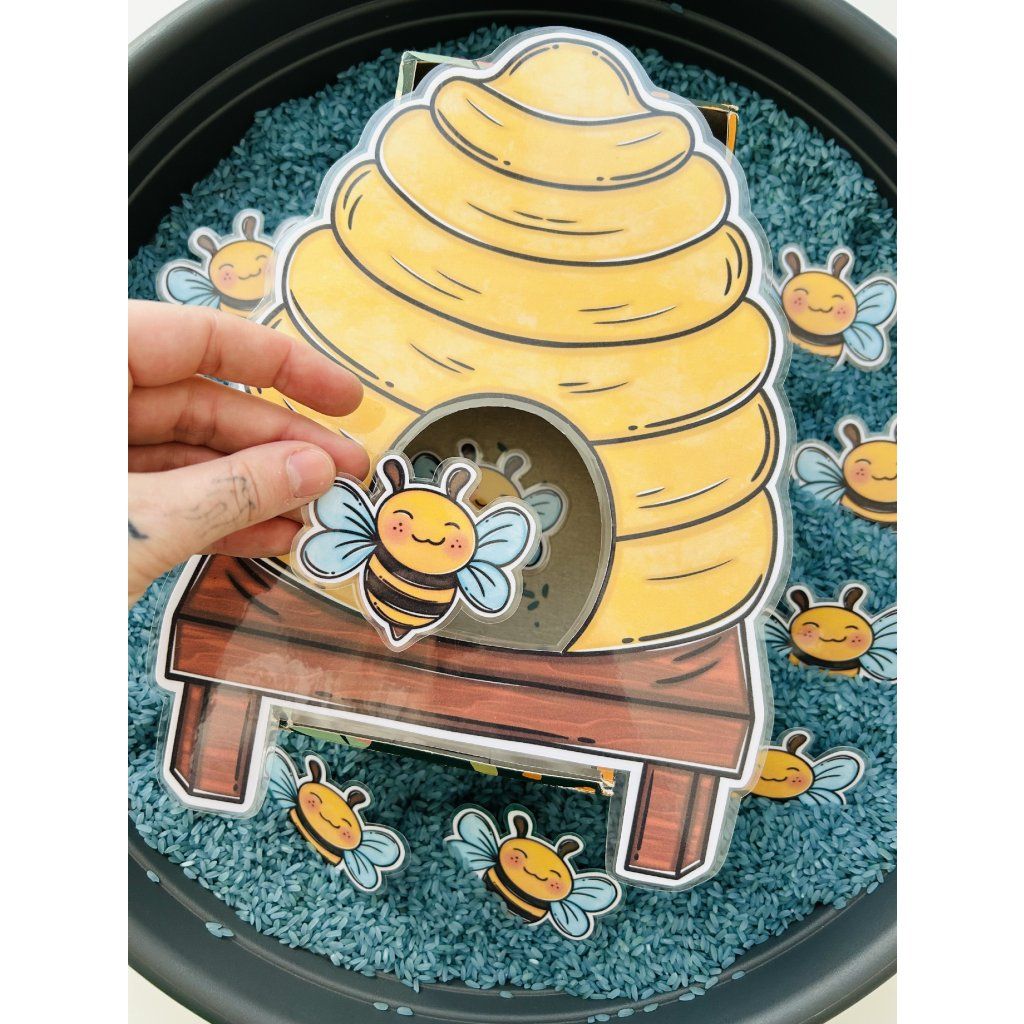 Tento materiál je jako stvořený pro sensory play, které děti přirozeně milují. Kartičky se včelkami se vkládají do sypkého materiálu (např. rýže, cizrna, těstoviny), kde je děti hledají, objevují a následně vkládají do včelího úlu – čímž dochází k intenzivnímu zapojení smyslů i soustředění.