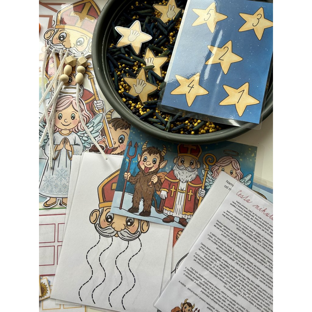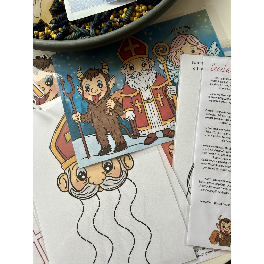 Materiál kombinuje příběh, poezii, ilustrace, pracovní listy, pohybové hry, senzorické a matematické aktivity tak, aby děti Mikuláše prožily, ne jen odbyly.
