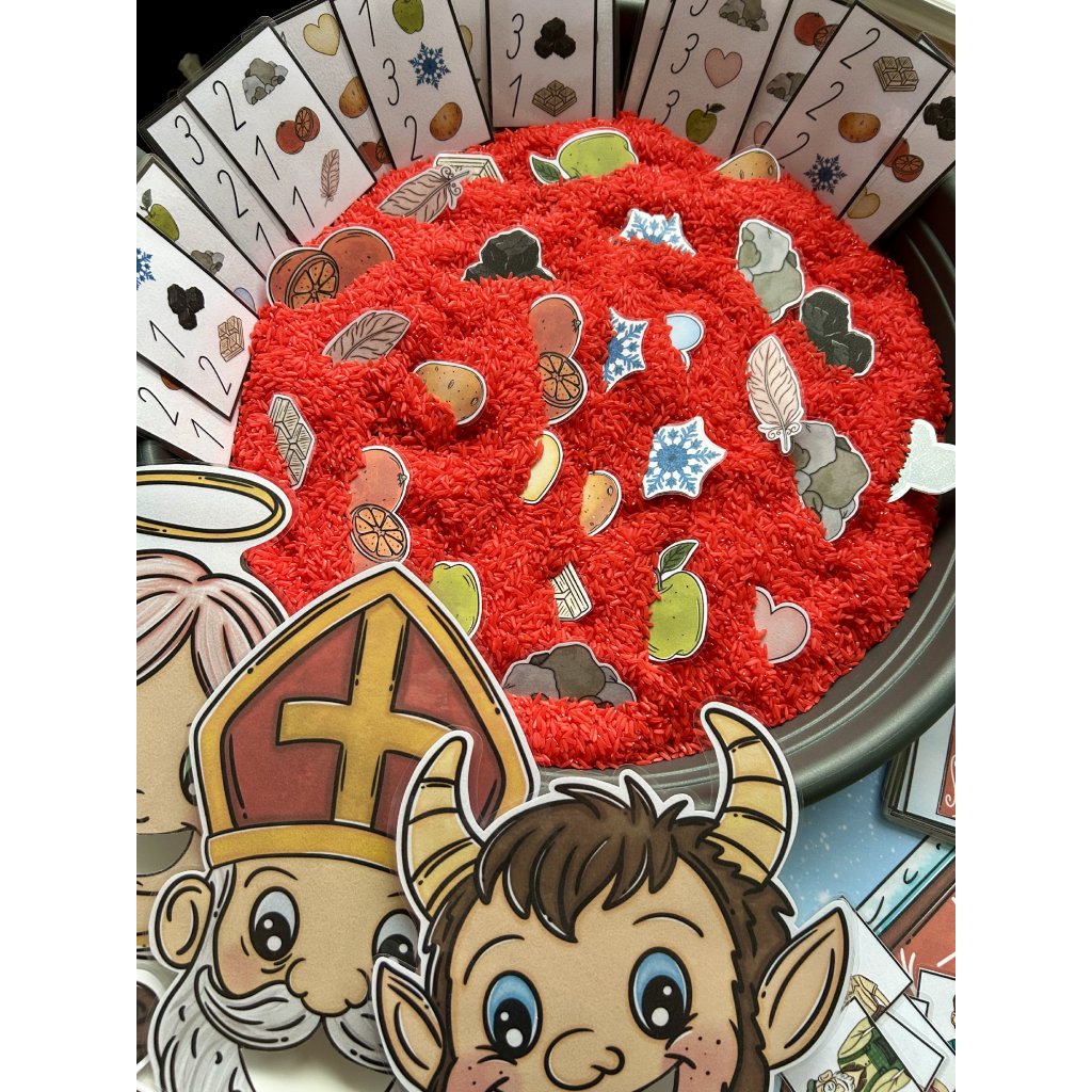 Krmíme Mikuláše, čerta a anděla – tři hlavy s vystřiženými ústy, do kterých děti vkládají obrázky podle druhu a počtu (pomeranče, uhlí, srdíčka…). Lze hrát volně nebo podle karet se zadáním.