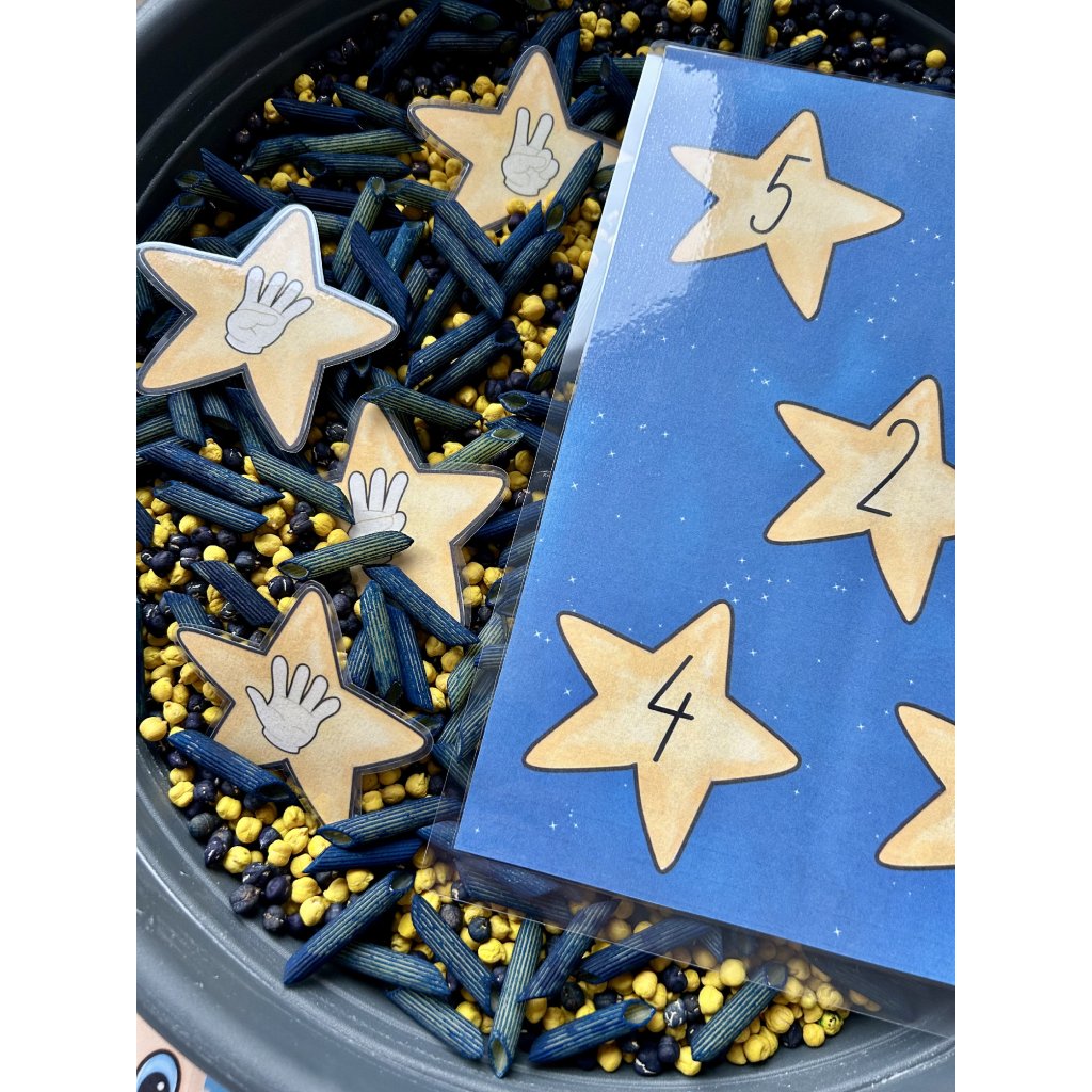 Hvězdičky s čísly a prsty (1–5) – přiřazování hvězd s rukou k číselným hvězdám, možnost sensory varianty v sypkém materiálu.