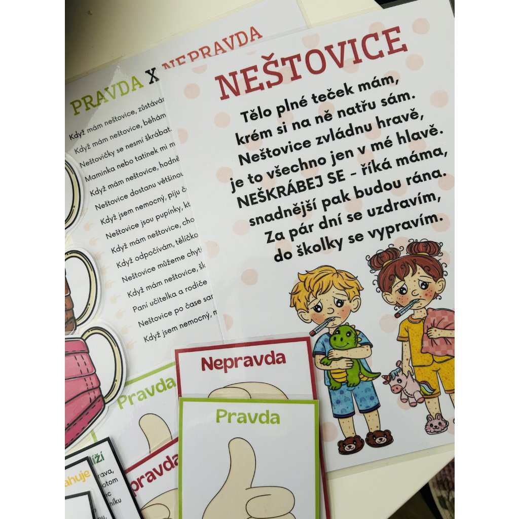 Přineste do třídy i domova klidnou, podpůrnou a laskavou atmosféru prostřednictvím citlivě zpracovaného tematického materiálu - Neštovice, který dětem srozumitelnou a bezpečnou formou pomáhá porozumět nemoci, jejímu průběhu i tomu, jak o sebe v tomto období pečovat. Materiál pracuje s příběhem, ilustracemi, hrou, pohybem i jemnou manipulací a umožňuje dětem téma nemoci prožít bez strachu, s pocitem jistoty a důvěry.