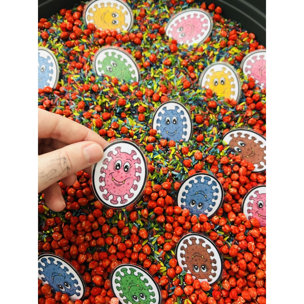 Smyslová aktivita s tříděním barev, vyhledáváním bacilů v sypkém materiálu a jejich přiřazováním. Podporuje soustředění, zrakové vnímání i povědomí o ochraně zdraví.