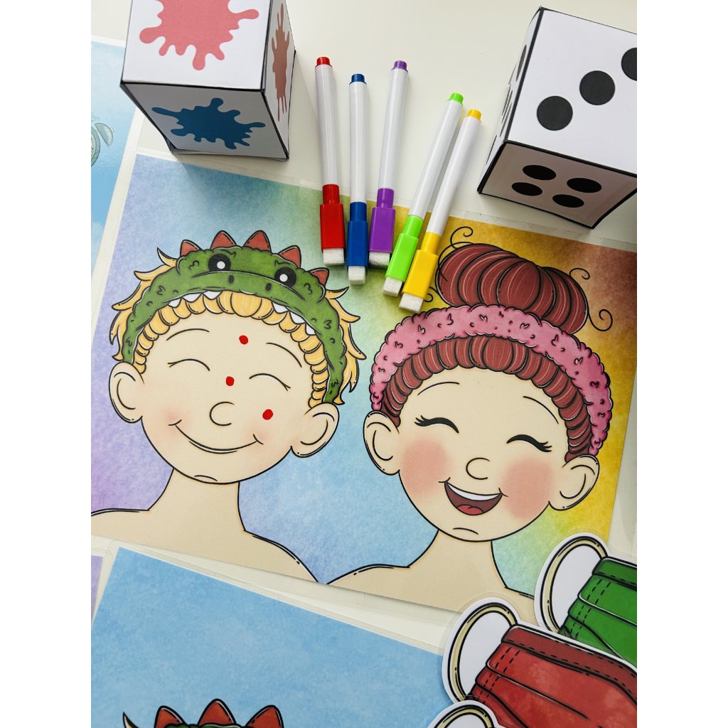 Matematicko-logická hra s kostkami, barvami a puntíky. Procvičuje počítání, rozlišování barev a jemnou motoriku hravou formou.