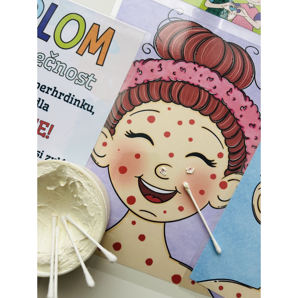 Jemná manipulační aktivita s vatovými tyčinkami, při které děti „ošetřují“ pupínky na ilustracích. Rozvíjí jemnou motoriku, koordinaci ruka–oko a empatii.
