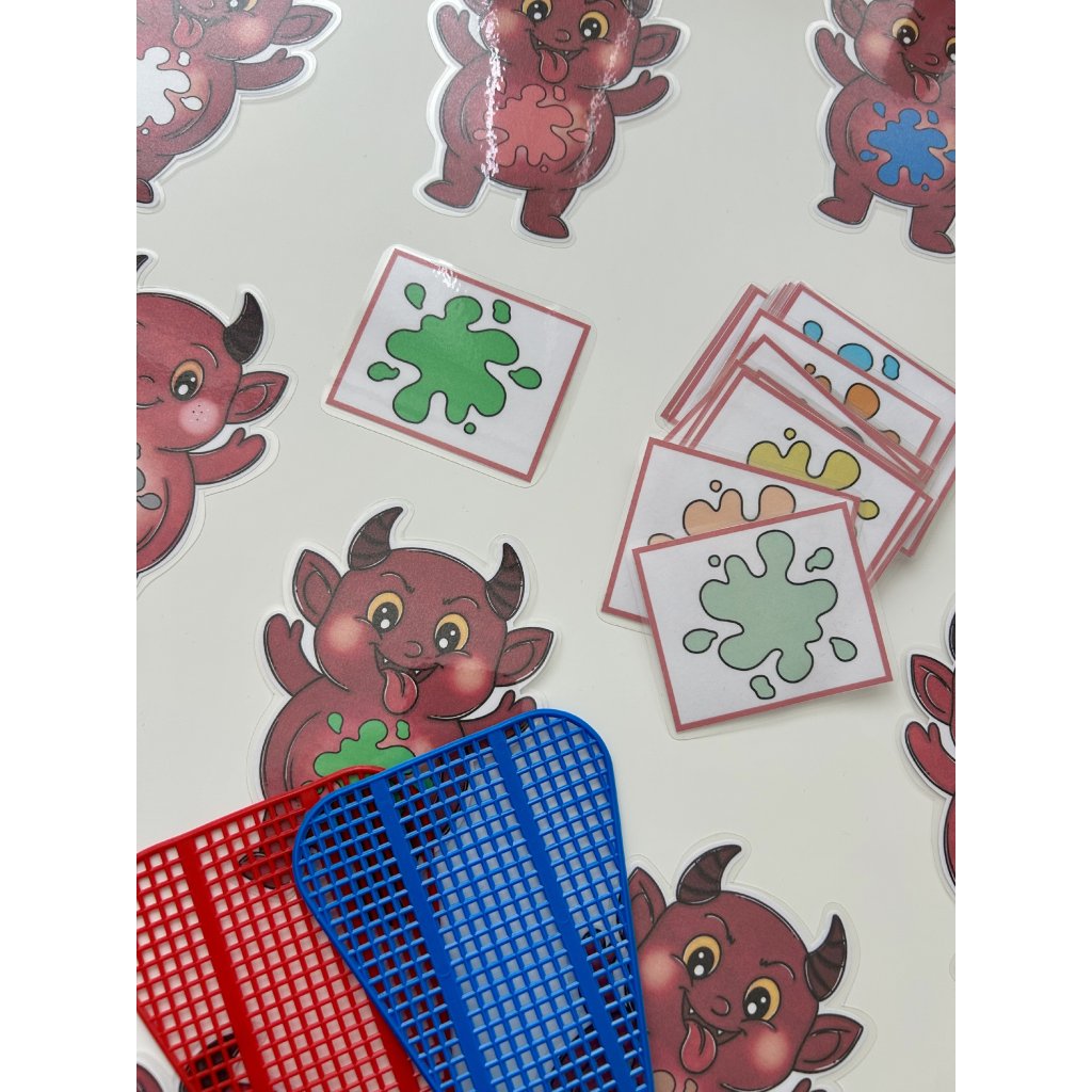 Plácni čerta je hravá aktivita, která dětem pomáhá zábavnou formou procvičit rozpoznávání barev. Materiál obsahuje celkem 60 kartiček – 30 kartiček se zadáním (barevná kaňka) a 30 čertů, kteří obsahují stejnou barevnou kaňku.