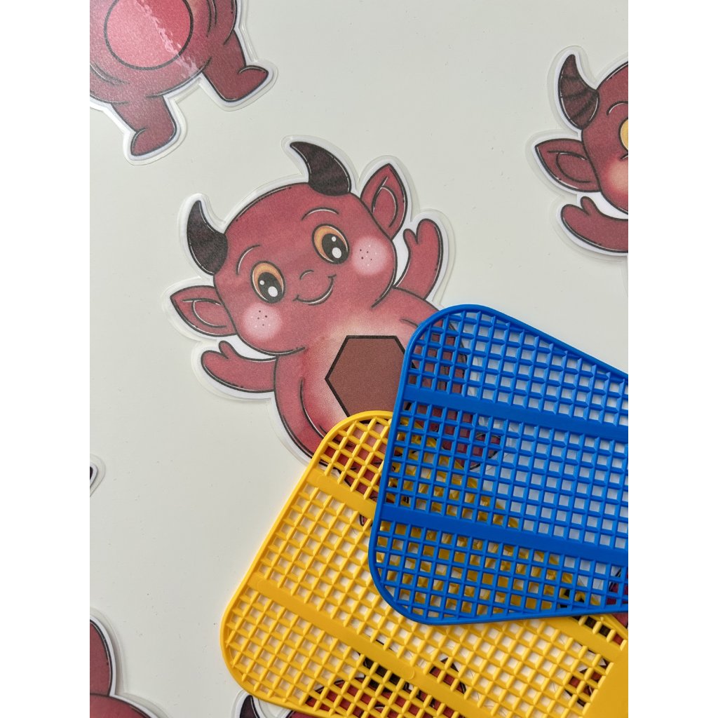 Čerti se rozmístí po koberci, lavici nebo jiné ploše. Každé dítě dostane plácačku na mouchy a úkol je jasný: co nejrychleji najít a PLÁCNOUT správného čerta podle právě otočeného zadání. Kdo zasáhne správně jako první, získává kartičku.
