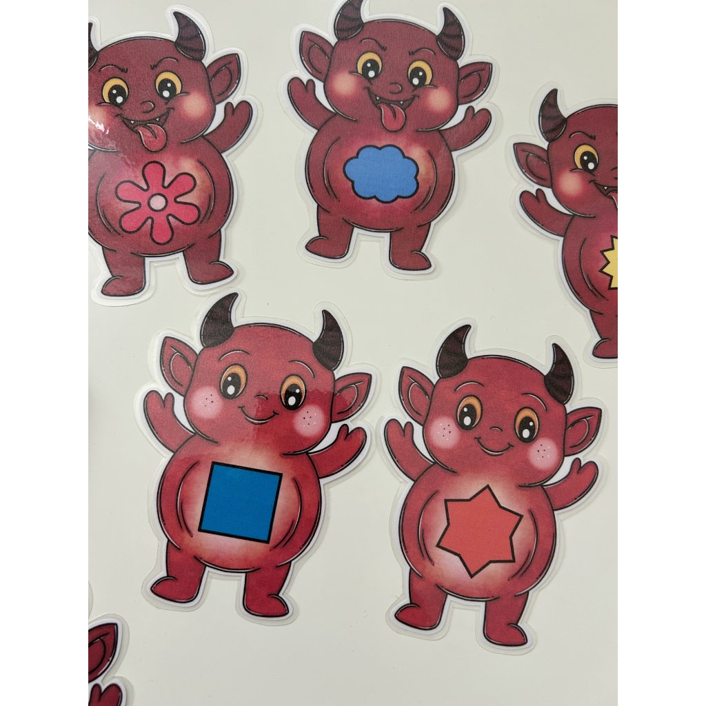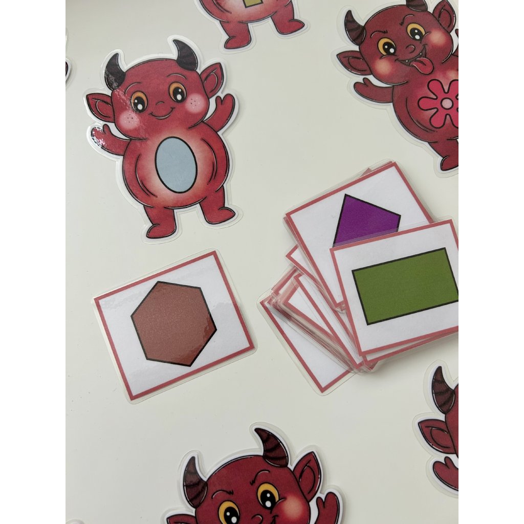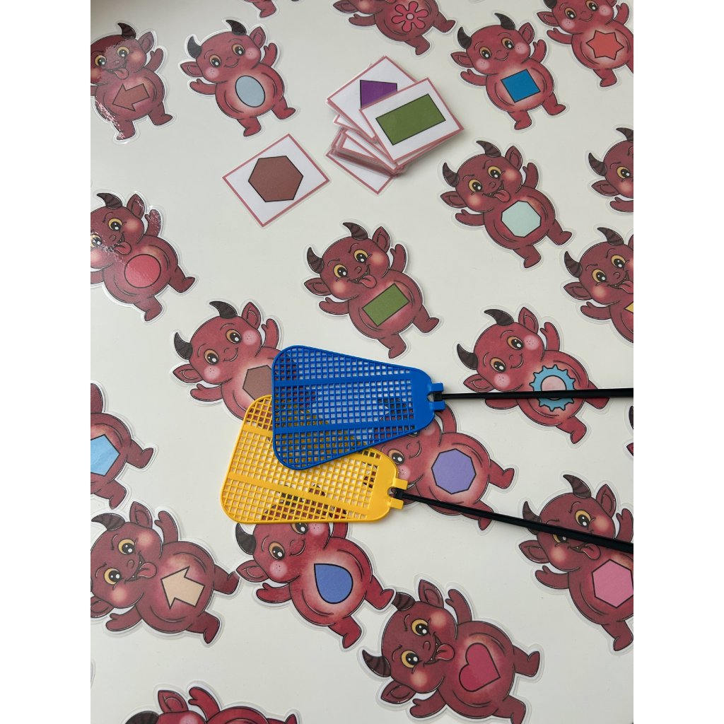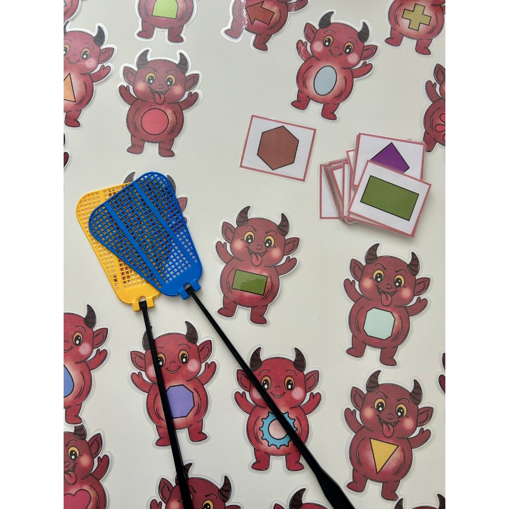 Plácni čerta je hravá aktivita, která dětem pomáhá zábavnou formou procvičit rozpoznávání tvarů a barev. Materiál obsahuje celkem 60 kartiček – 30 kartiček se zadáním (barevný tvar) a 30 čertů, kteří daný tvar a barvu znázorňují.