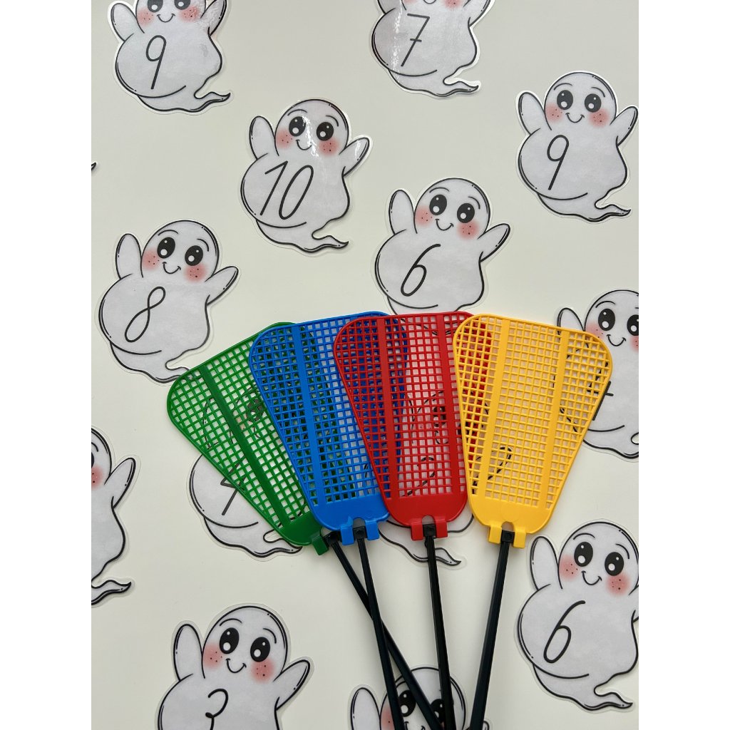 Duchové se rozmístí po koberci, lavici nebo jiné ploše. Každé dítě dostane plácačku na mouchy a úkol je jasný: co nejrychleji najít a PLÁCNOUT správného ducha podle právě otočeného zadání. Kdo zasáhne správně jako první, získává kartičku.