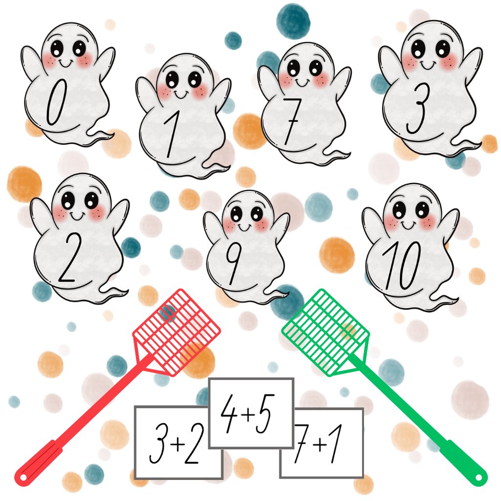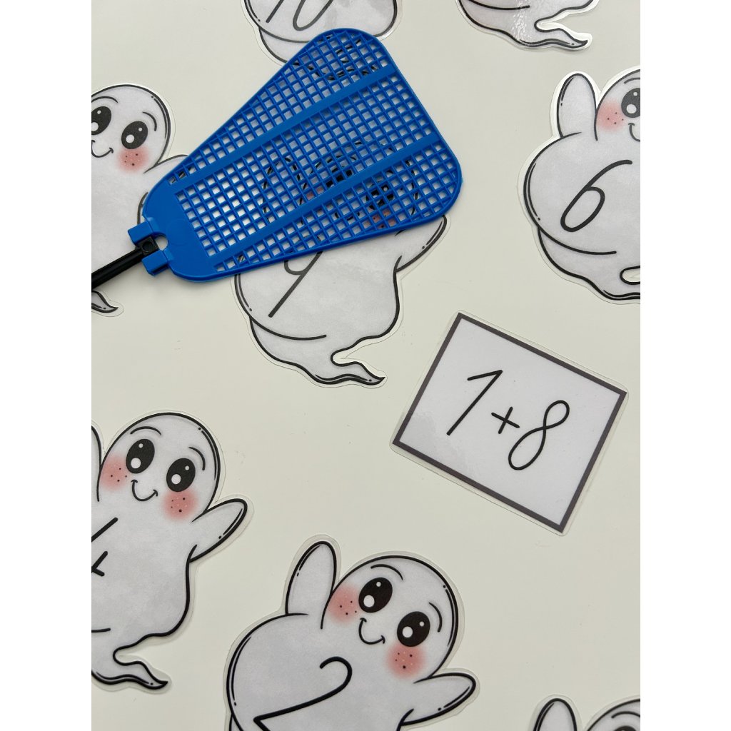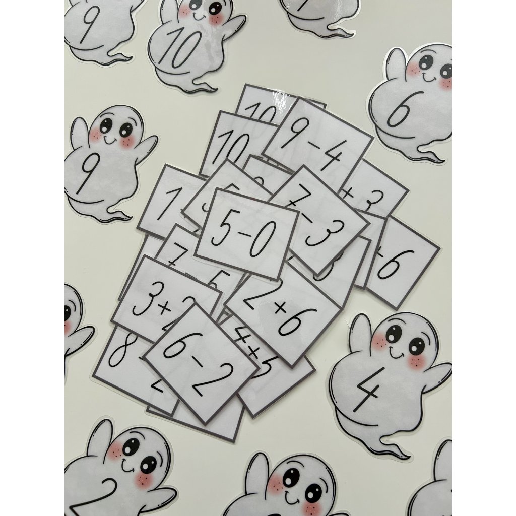 Plácni ducha je hravá aktivita, která dětem pomáhá zábavnou formou procvičit sčítání a odčítání do 10. Materiál obsahuje celkem 52 kartiček – 30 kartiček se zadáním (příklad na sčítání a odčítání) a 22 duchů, kteří obsahují číslo od 0 do 10.