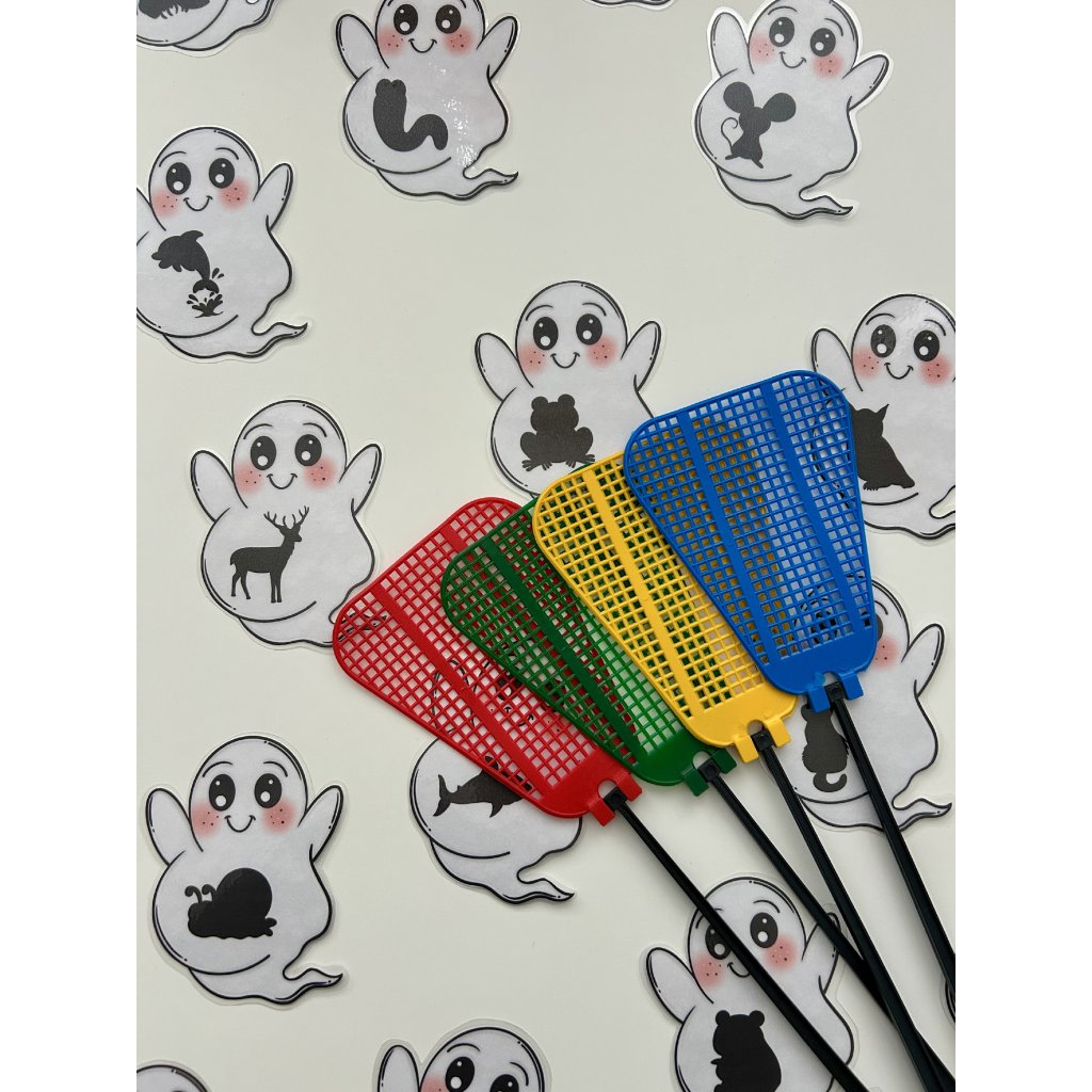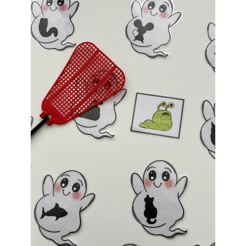 Duchové se rozmístí po koberci, lavici nebo jiné ploše. Každé dítě dostane plácačku na mouchy a úkol je jasný: co nejrychleji najít a PLÁCNOUT správného ducha podle právě otočeného zadání. Kdo zasáhne správně jako první, získává kartičku.
