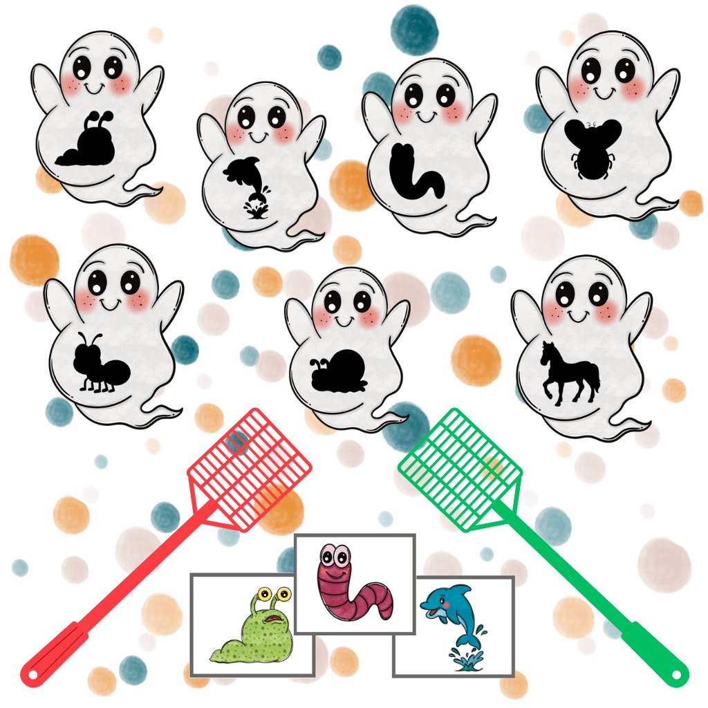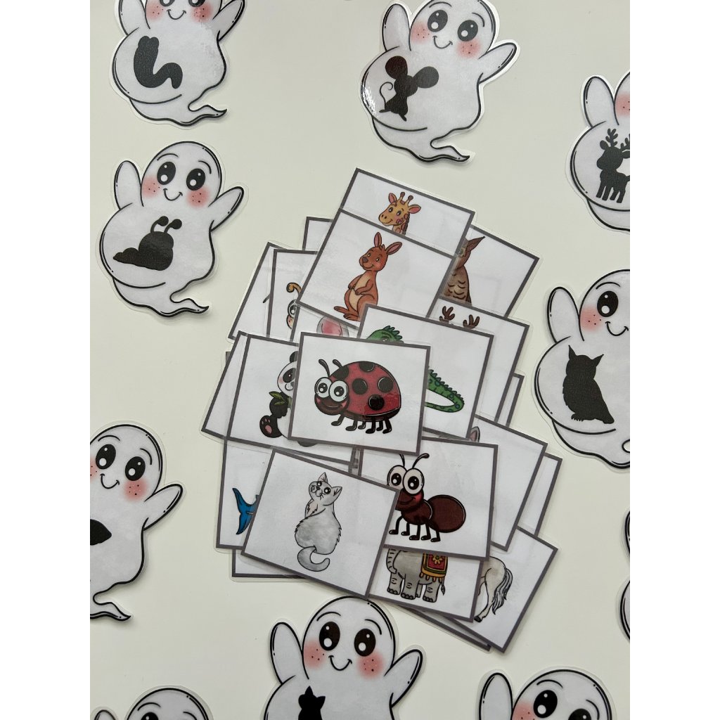 Plácni ducha je hravá aktivita, která dětem pomáhá zábavnou formou procvičit rozpoznávání zvířátek a jejich stínů. Materiál obsahuje celkem 60 kartiček – 30 kartiček se zadáním (barevná zvířátka) a 30 duchů, kteří znázorňují stíny zvířátek.