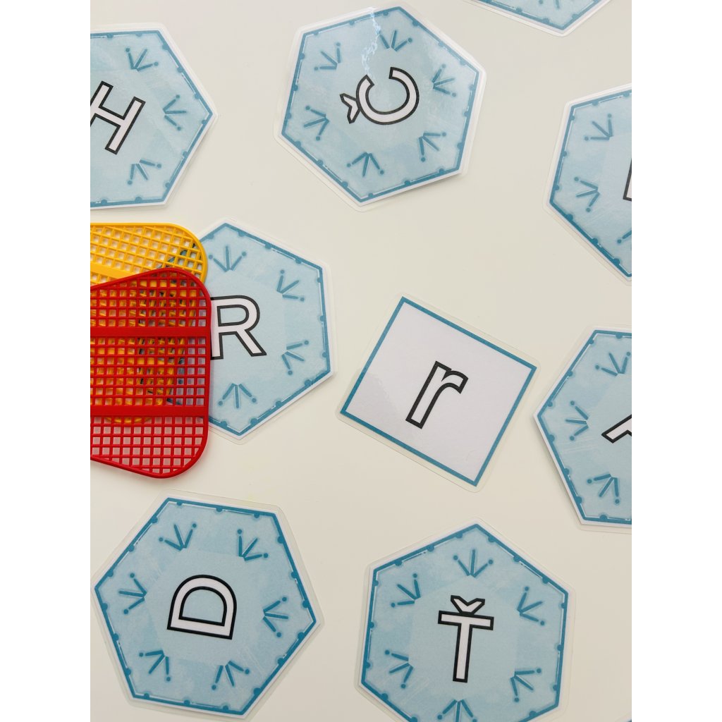 Plácni vločku je hravá aktivita, která dětem pomáhá zábavnou formou procvičit malá a velká písmena abecedy. Materiál obsahuje celkem 68 kartiček – 34 kartiček se zadáním (malá písmena abecedy) a 34 vloček, které znázorňují velká písmena abecedy.