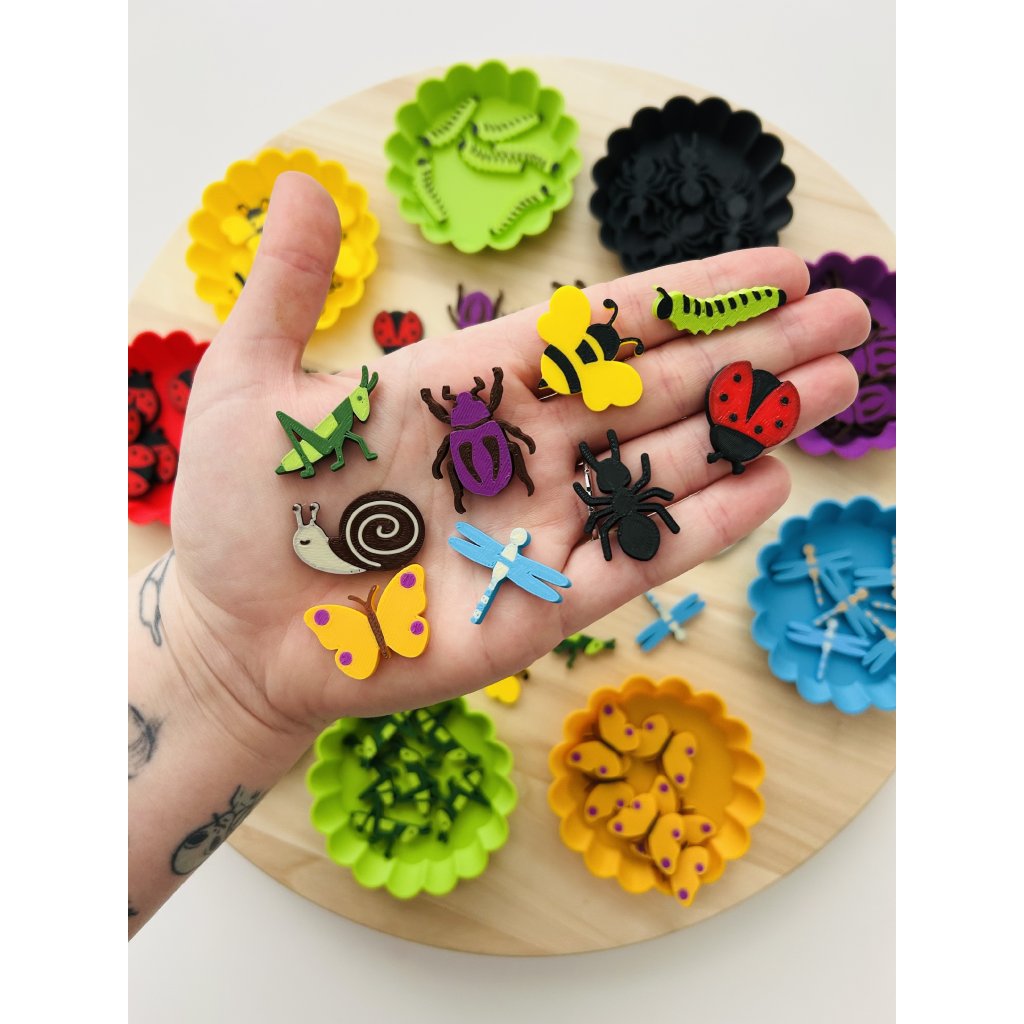 Zkuste jednotlivé druhy schovat do rýže, vody nebo písku a nechte děti hmyz hledat a třídit podle barev či druhů. Při hledání rozvíjejí jemnou motoriku, soustředění i trpělivost. Figurky můžete obtiskávat do modelíny.