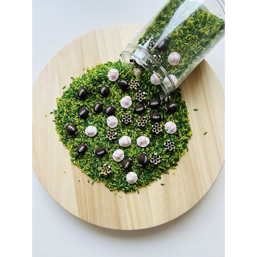 Ručně barvenou smyslovou směs z těstovin a rýže v zeleném odstínu trávy, doplněnou o tematické sportovní prvky Barveno potravinářskými a netoxickými akrylovými barvami. Každý kus je originál – barvy i provedení se mohou mírně lišit od fotografie.