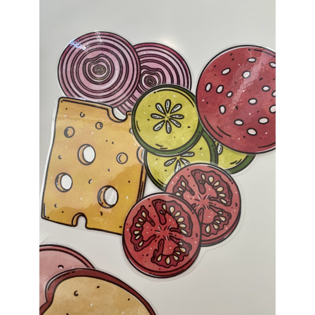9 ingrediencí běžně používaných na sendvič (chleba, sýr, okurka, vajíčko, rajče, salám, salát, šunka, cibule),