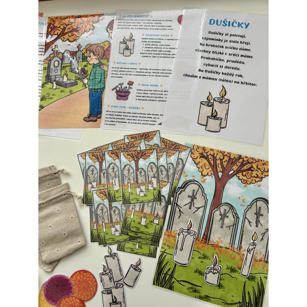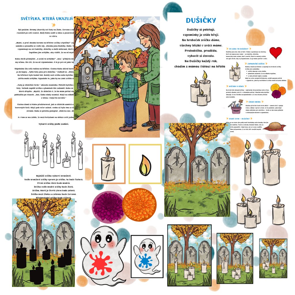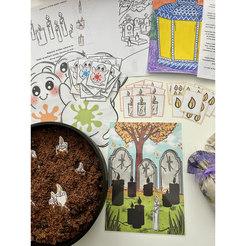 Děti se seznámí s tradicemi dušiček, procvičí si barvy, čísla i paměť, vyzkouší si smyslové aktivity (čich, hledání v rýži/písku) a užijí si také tvoření a pohybové hry. Celý materiál je koncipovaný tak, aby se dal využívat opakovaně – stačí kartičky a pomůcky vystřihnout a zalaminovat.