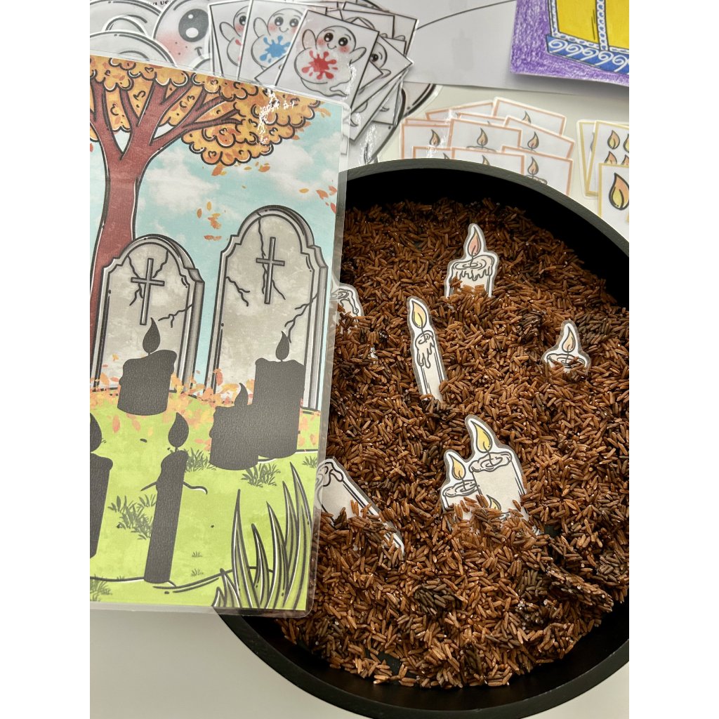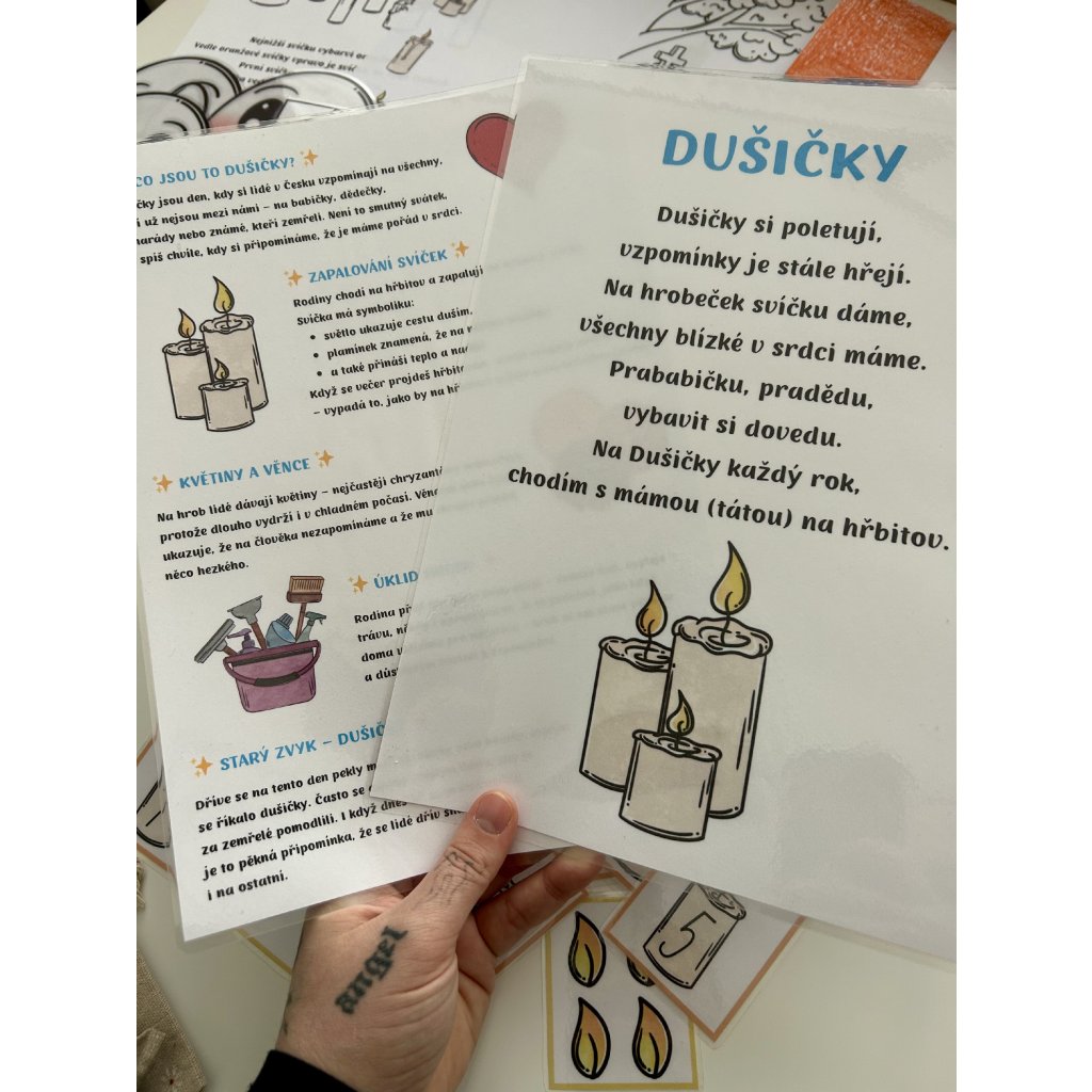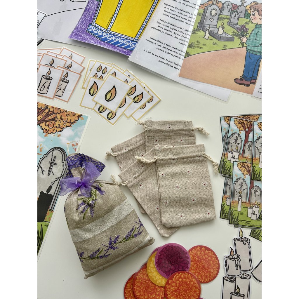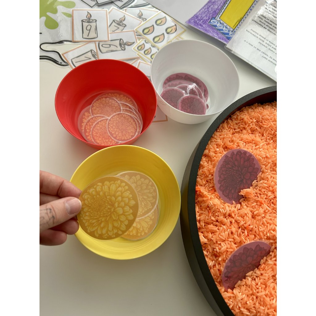 Děti se seznámí s tradicemi dušiček, procvičí si barvy, čísla i paměť, vyzkouší si smyslové aktivity (čich, hledání v rýži/písku) a užijí si také tvoření a pohybové hry. Celý materiál je koncipovaný tak, aby se dal využívat opakovaně – stačí kartičky a pomůcky vystřihnout a zalaminovat.