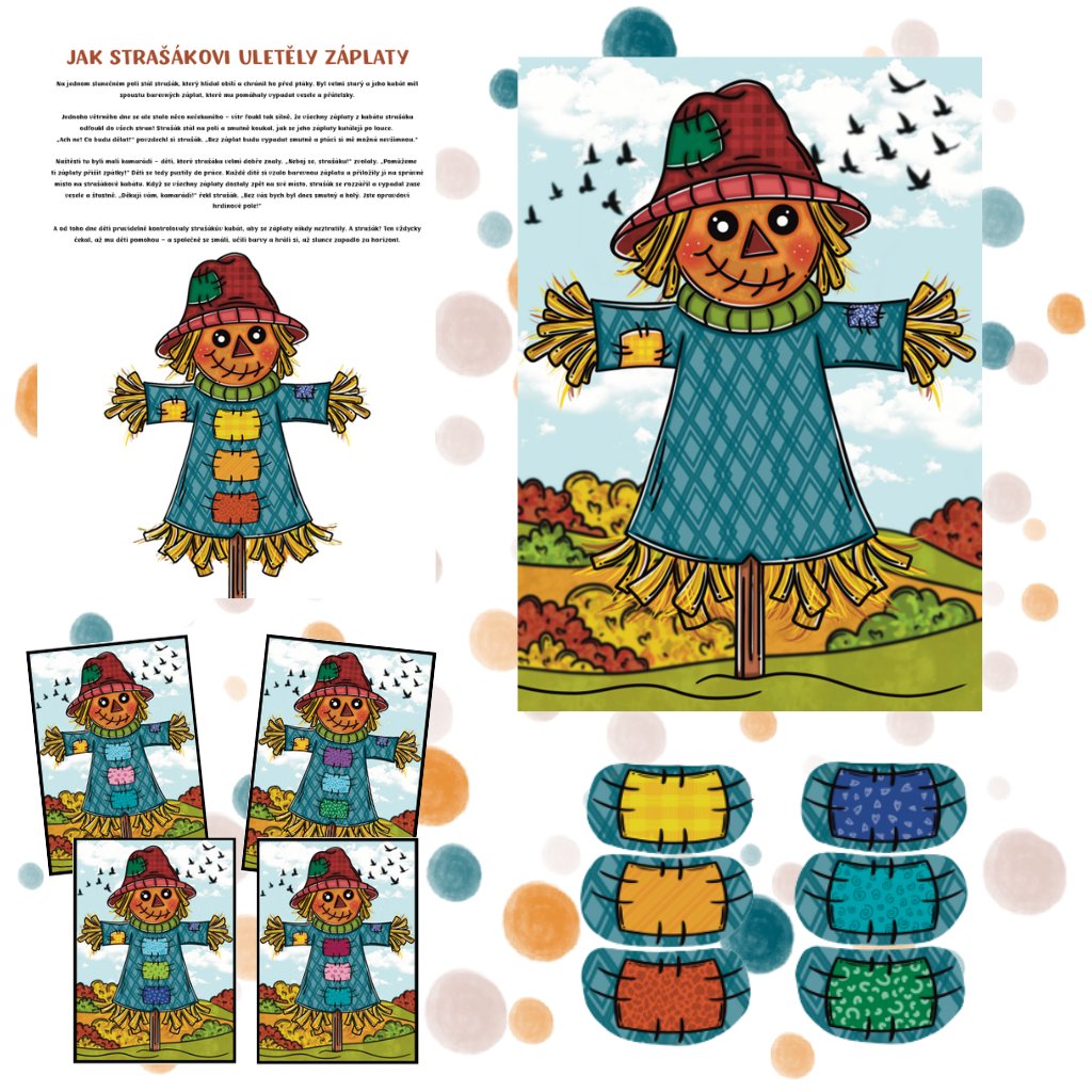Pro motivaci dětí je připraven i krátký příběh Jak strašákovi uletěly záplaty. Ten dětem pomůže vcítit se do situace, rozvíjí jejich představivost a podporuje aktivní zapojení do hry – děti mají možnost strašákovi pomoci, a přitom si nenásilně procvičují znalosti barev, paměť, prostorovou orientaci i logické myšlení.