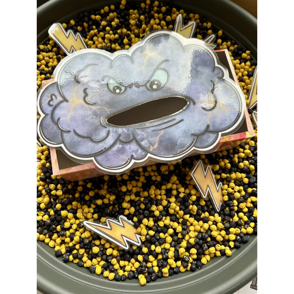 - Krmící hlavy – mrak a blesky + košíček s dobrotami – senzorické hry, třídění podle barvy a počtu, možnost úkolů v prostoru