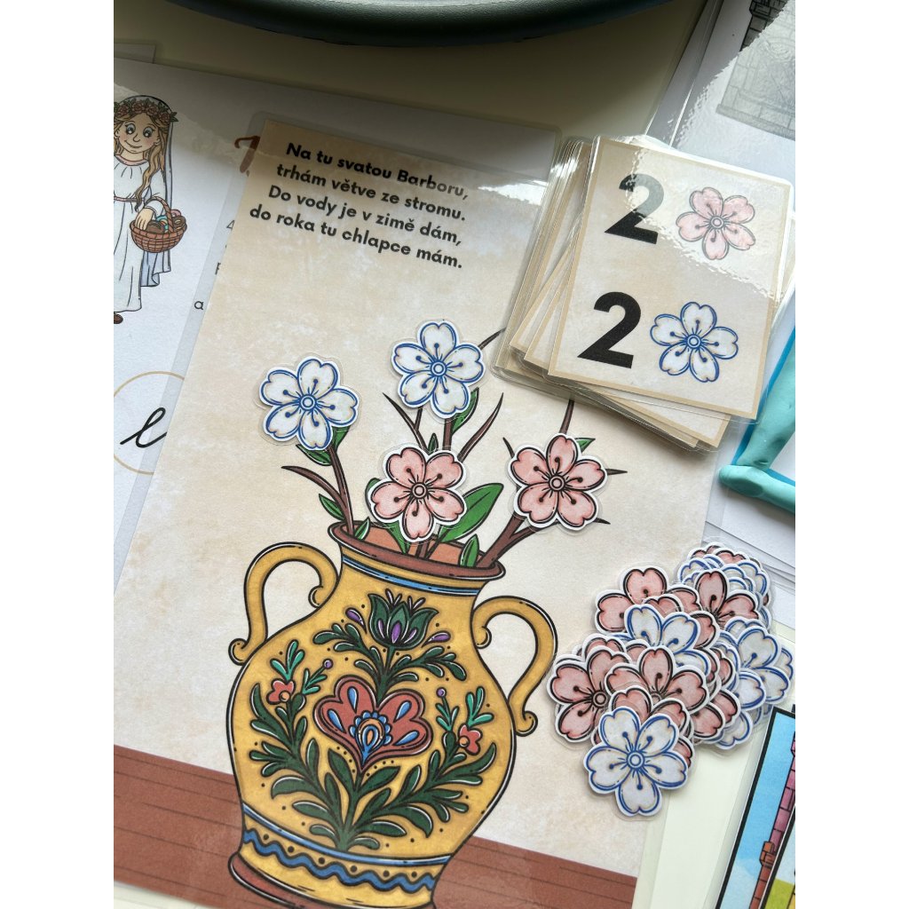 - Senzorická a počítací aktivita – skládání bílo–růžových květů na větvičky (20 zadání, možnost volné hry i pohybové varianty)