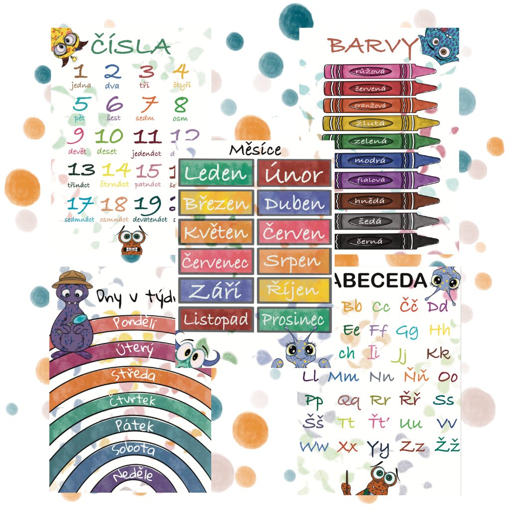 - Vizuální podpora učení: Plakáty slouží jako neustálé vizuální podněty, které pomáhají dětem snadno si zapamatovat základní vzdělávací informace. Díky tomu, že je děti vidí každý den, stávají se tyto informace přirozenou součástí jejich znalostí.