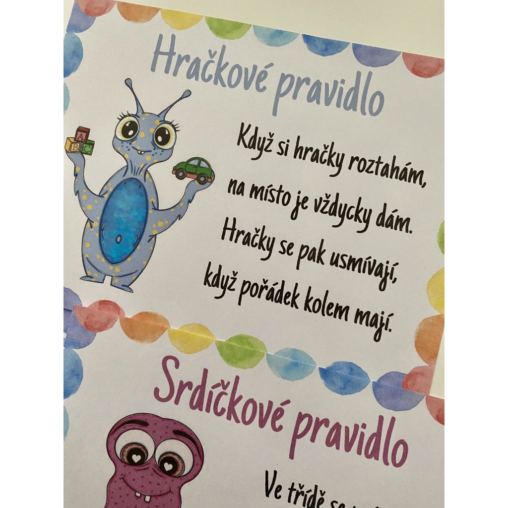 - 9 pravidel ve formě básničky: Každé pravidlo je ztvárněno jako krátká a hravá básnička, která dětem připomíná důležité zásady chování ve třídě. Básničky jsou jednoduché, rytmické a snadno zapamatovatelné, což dětem usnadňuje jejich pochopení a dodržování.