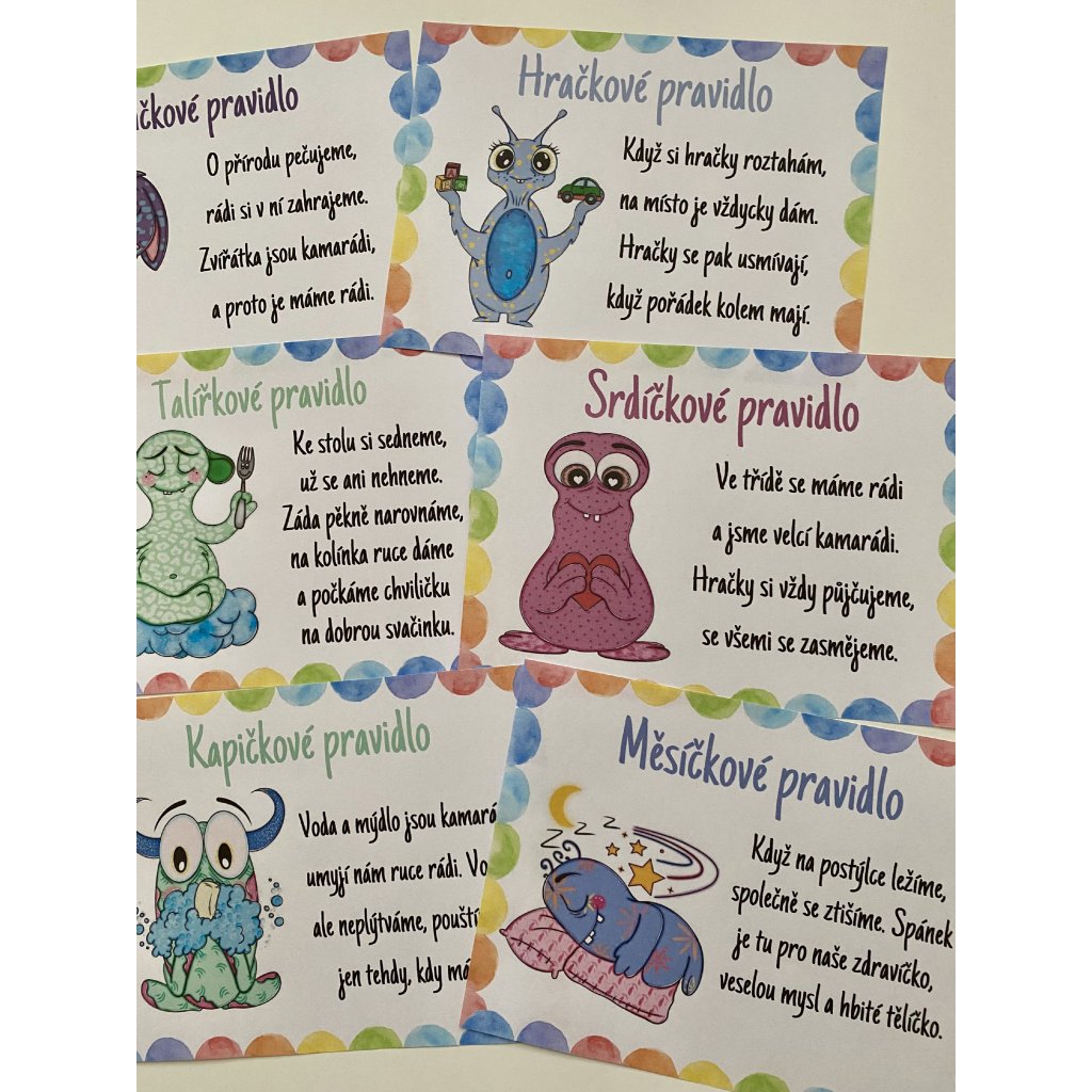 - Přehlednost a srozumitelnost: Každé pravidlo je jasně formulované a zpracované tak, aby bylo snadno pochopitelné pro děti v předškolním věku. Díky tomu je práce s pravidly přirozená a nenásilná.