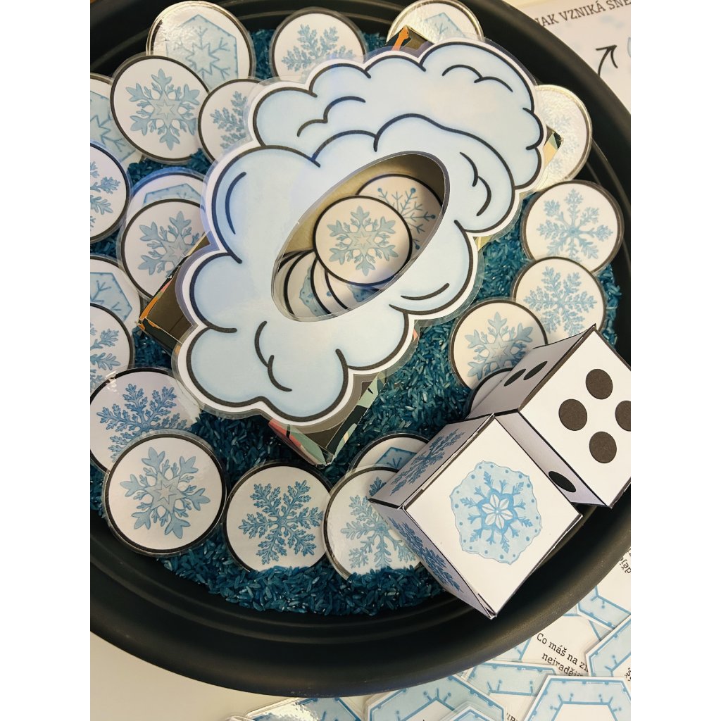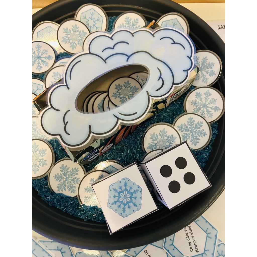 Hra - Mrak plný vloček propojuje sensory play se sypkým materiálem, rozpoznávání tvarů a počítání podle kostek – ideální pro individuální i skupinovou práci.