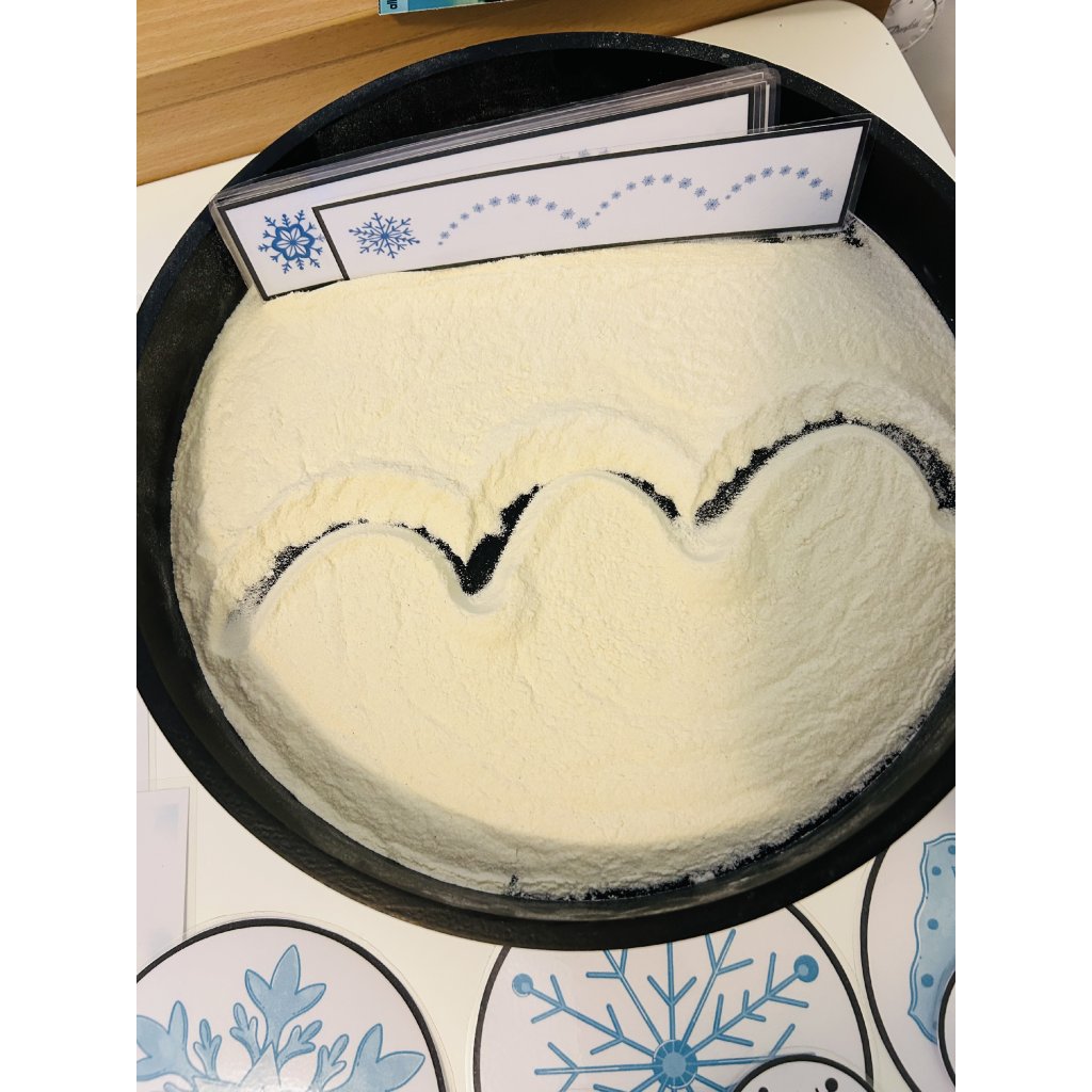 Obtahování vloček, kreslení vzorů do mouky a práce s kartičkami podporují uvolnění ruky, koordinaci oko–ruka a přípravu na psaní.