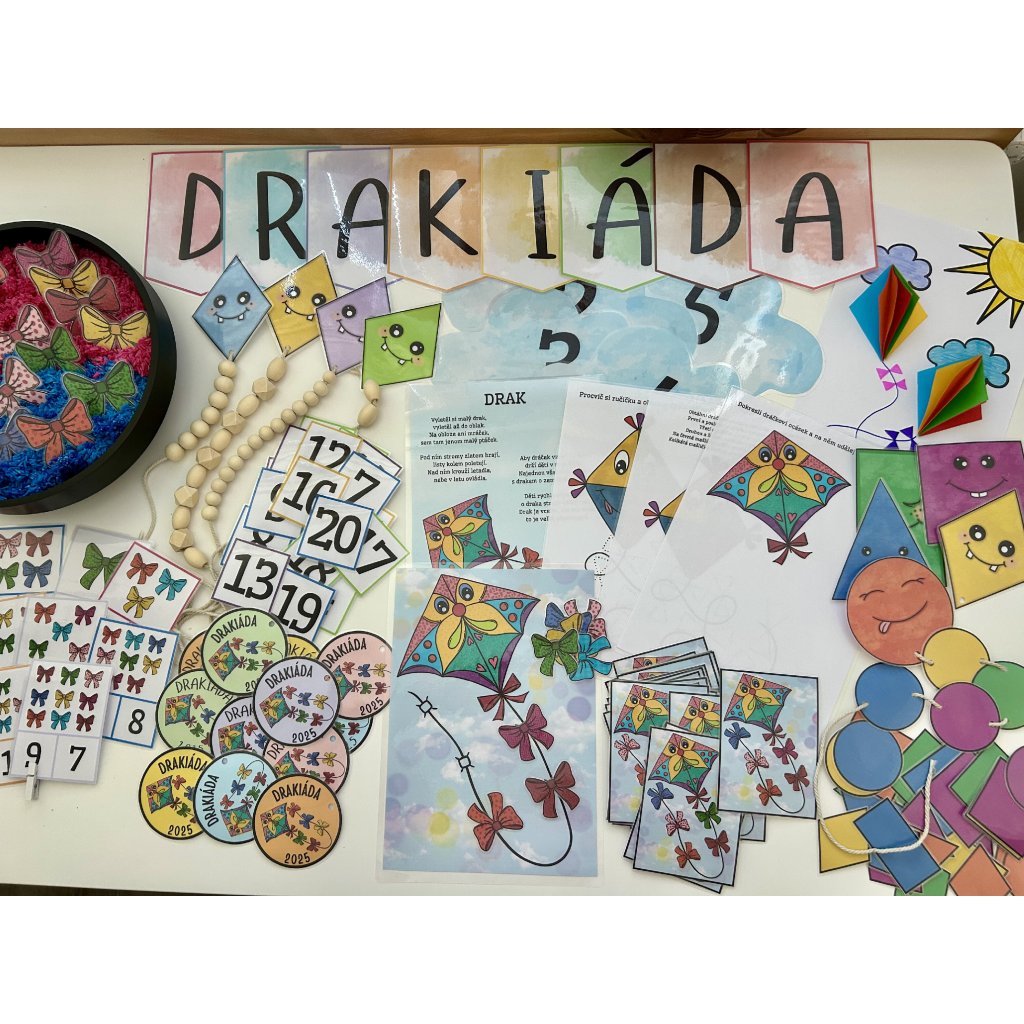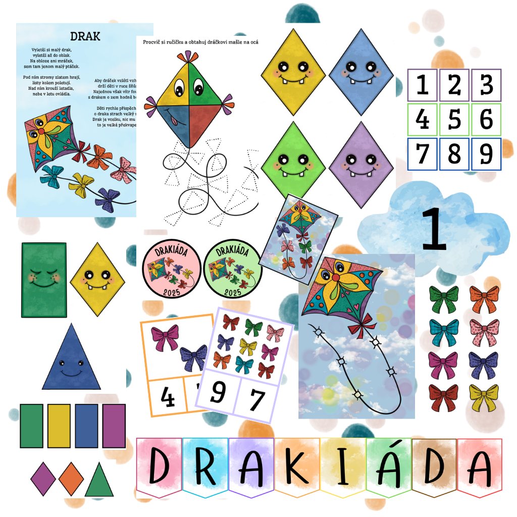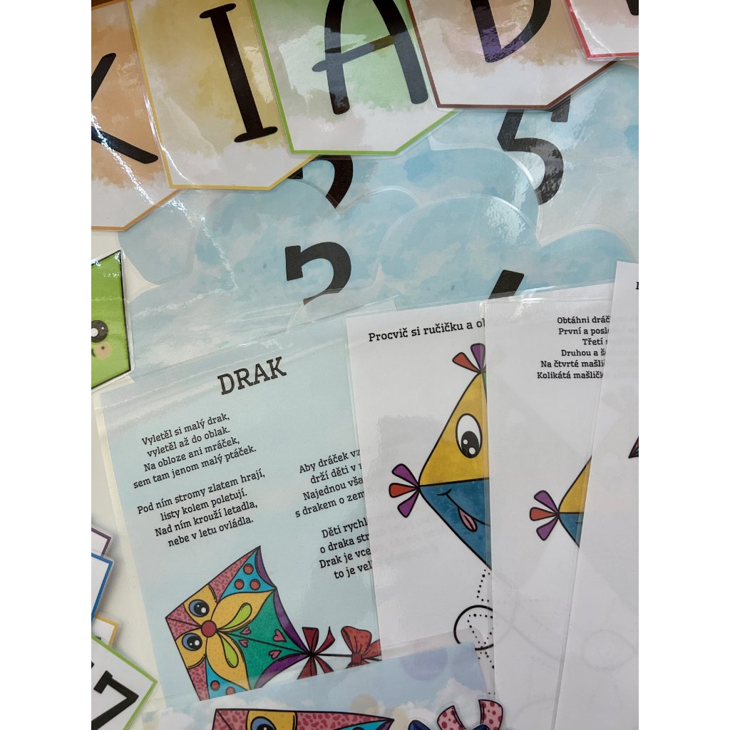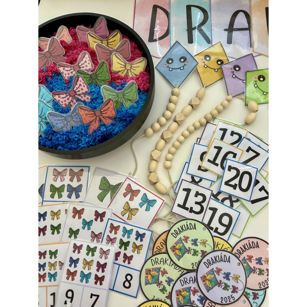 - skládání barevných mašlí na draka – 1 drak s pozadím, 8 mašlí a 100 kartiček se zadáním