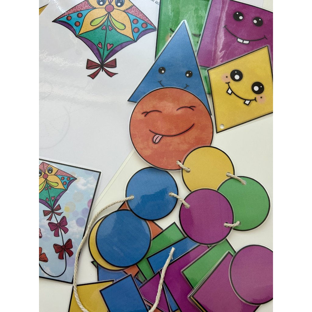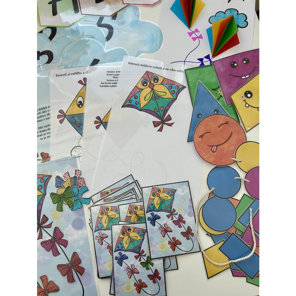 - 5 draků v různých geometrických tvarech + 8 malých tvarů k přiřazování (navlékání na provázky)